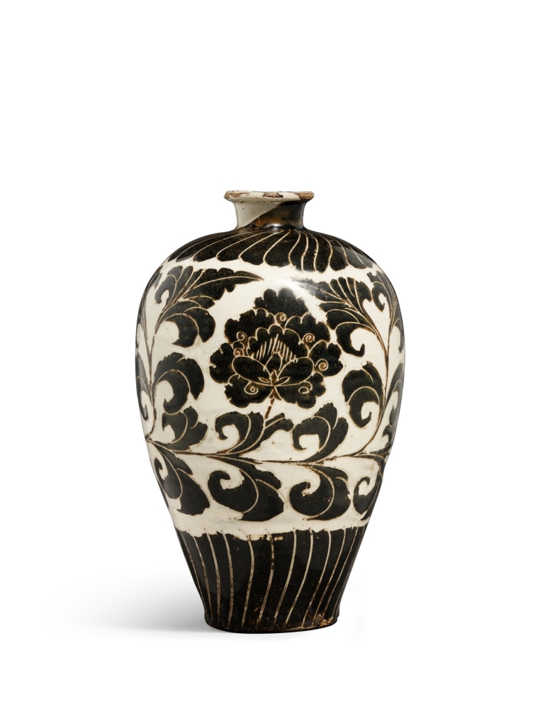 此外,另一件締造千萬的宋瓷,則為北宋《磁州窰白地剔黑彩牡丹紋梅瓶》,迎風搖曳的牡丹紋飾,是11至12世紀初河北磁州窰裝飾器中稀有的傑作。以1600萬港元落槌,成交價1989萬5000港元,一樣由現場「8869」牌號買家競得。此瓶不同於磁州窰遺址常見的單色剔刻或彩繪品種,採用了極為費工的「雙層化妝土剔劃」工藝,先施白色化妝土為底,再覆黑色化妝土,而後精準剔刻黑色表層以顯露下層潔白胎土,最後罩透明釉燒成。
