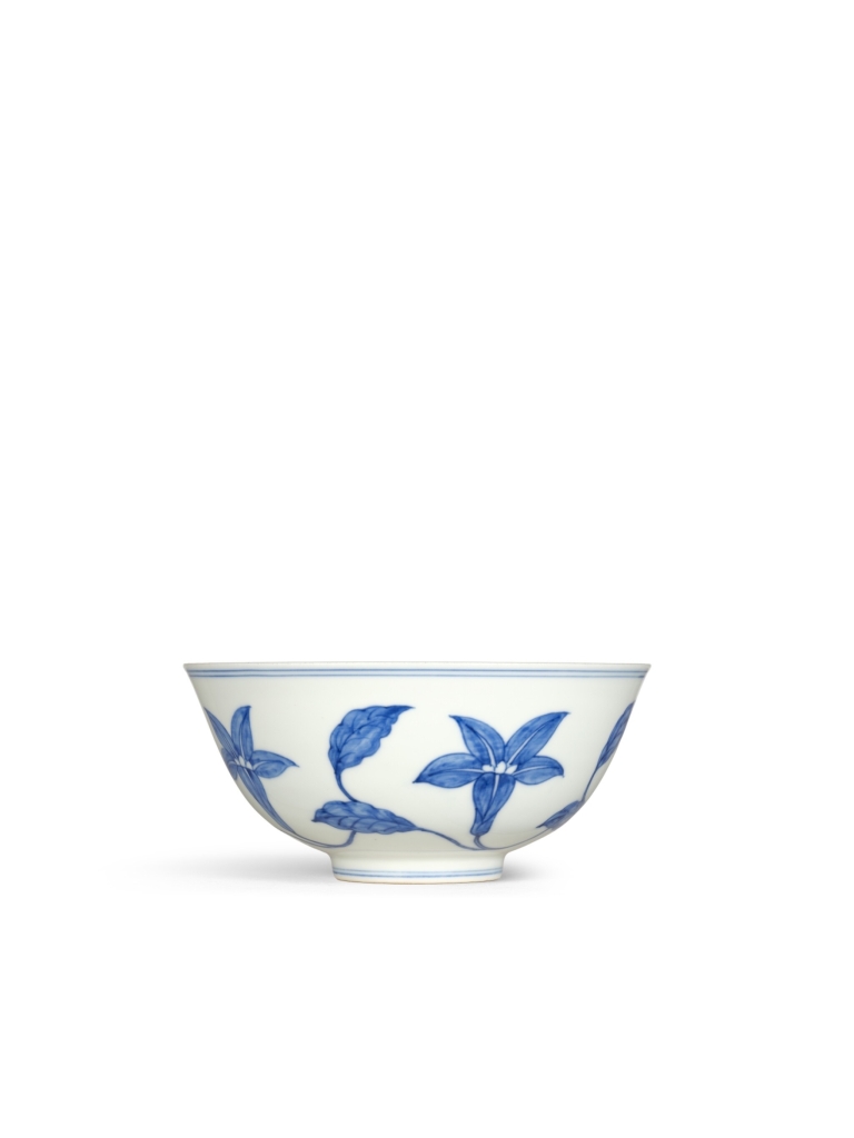 2.明成化《青花梔子花宮盌》,「大明成化年製」款,徑14.7公分,估價4000萬至8000萬港元,成交價3514萬5000元。