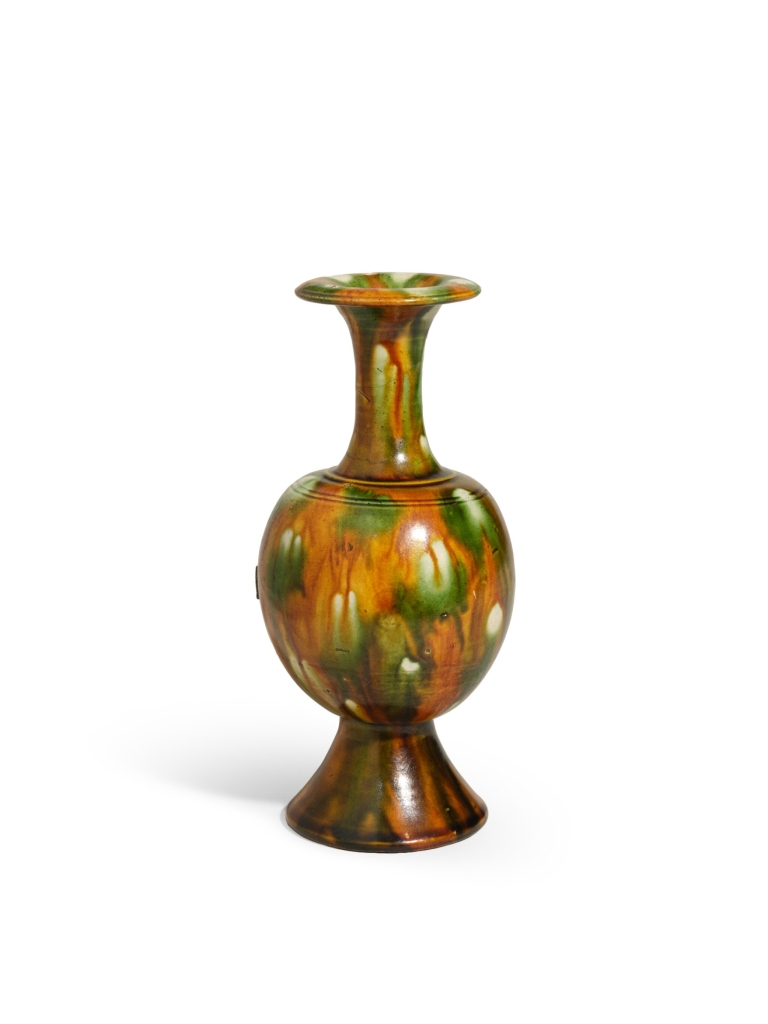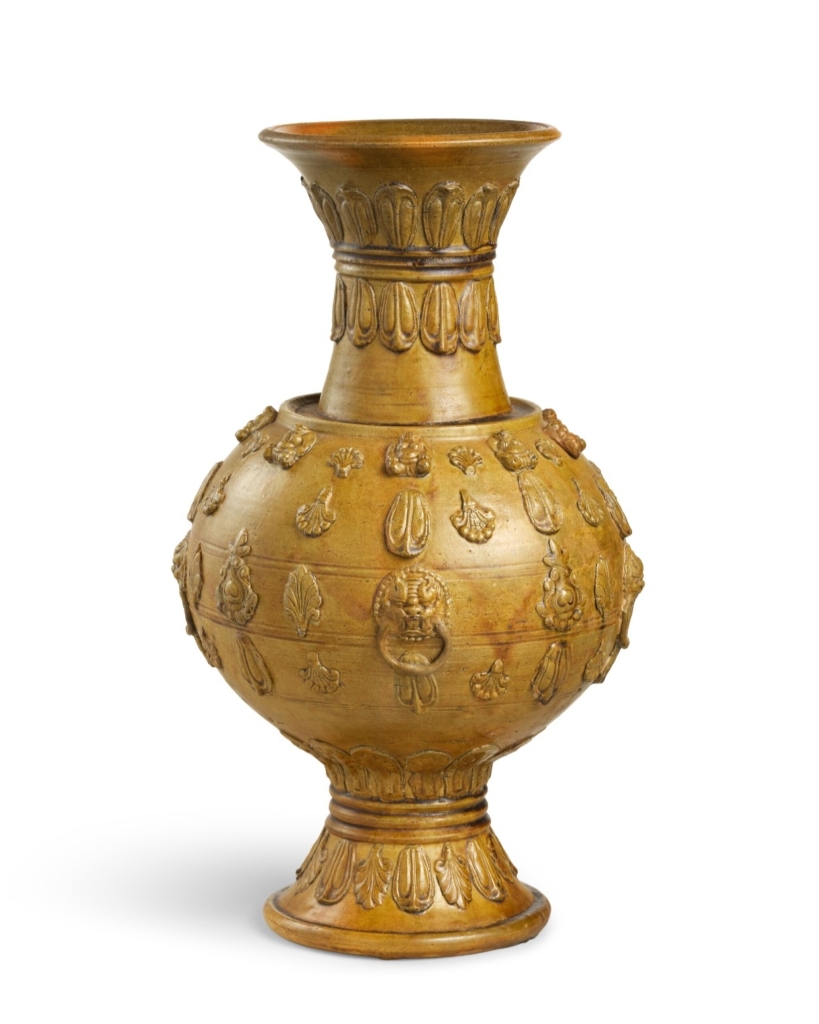 此外,高古陶瓷之唐三彩品類成交表現亮眼。日本文壇巨擘川端康成舊藏的唐《三彩撇口瓶》,估價60萬至80萬港元,逾低估價4倍之成交價292萬1000港元。唐《灑藍彩蓋罐》估價20萬至40萬港元,逾低估價9倍多之成交價190萬5000港元。唐《三彩螺形水丞》估價8萬至16萬港元,逾低估價10倍多之成交價82萬5500港元。此外,北魏《灰陶加彩女官俑》容貌生動傳神,估價40萬至80萬港元,受競逐追捧,以逾估價8倍多之342萬9000港元成交。隋代《青釉塑貼忍冬蓮瓣紋鋪首尊》為鉛釉陶器當中較罕見的大體量陶器。貼花尊端莊大器,相同器形近例極罕,同期器物釉色多為綠或褐色,而本尊釉色接近琥珀,珍罕難得,應為海內外孤例,歷年拍賣場鮮見。本尊器形與南北朝蓮花尊接近,裝飾則極為類似,體現佛教於政局動盪之世傳播迅速,影響深遠。此外,本品為低溫鉛釉,而蓮花尊多為高溫青釉,亦使本尊更為珍貴特別。成交價431萬8000港元(約合41萬英鎊),其前拍賣紀錄為2015年倫敦蘇富比成交價26.9萬英鎊,十年後拍場再現,漲勢可觀。