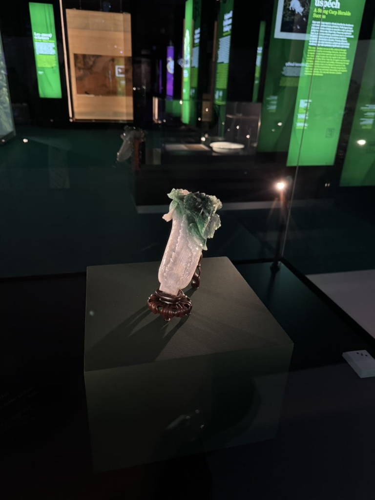 其中最受矚目的〈翠玉白菜〉,為清代翡翠雕刻藝術代表作,由天然雙色玉料巧琢而成,綠葉與白莖色澤自然過渡,葉間藏有螽斯與蚱蜢,寓意繁衍生息。該件文物長年為臺北故宮鎮院之寶,此次為其首次遠征歐洲,捷克館方特別將其列為展覽主視覺,說明「這件精美的雕刻作品首次在歐洲展出,被認為是最珍貴的文化瑰寶之一」,並比喻其「受歡迎程度堪比羅浮宮〈蒙娜麗莎〉」(In terms of popularity, this decorative object can be compared to the Mona Lisa in the Louvre in Paris.),成功引起歐洲觀眾共鳴。
