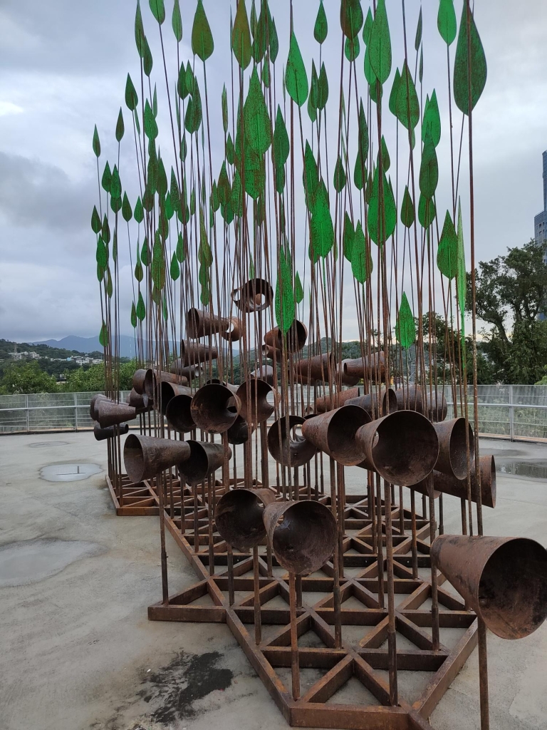 塔頂更有《隨風搖曳的聲物》,是王仲堃與其藝術團隊「先驗物件」又一力作,數支如針葉林木輪廓一般聳立生長的聲音雕塑裝置,以金屬桿延伸至號角狀造型,再向上延展細長鐵棒與扇葉構件。風吹時發出清脆敲擊與共鳴聲,號角亦具傳聲與互動功能。裝置坐落於港口高地的基隆塔塔頂,對應基隆的海風、地景與工業記憶, 觀者可於圓形空間中漫步,感受氣流、聲響與歷史交織的臨場經驗,聆聽風如何喚醒地方與身體的感知連結。