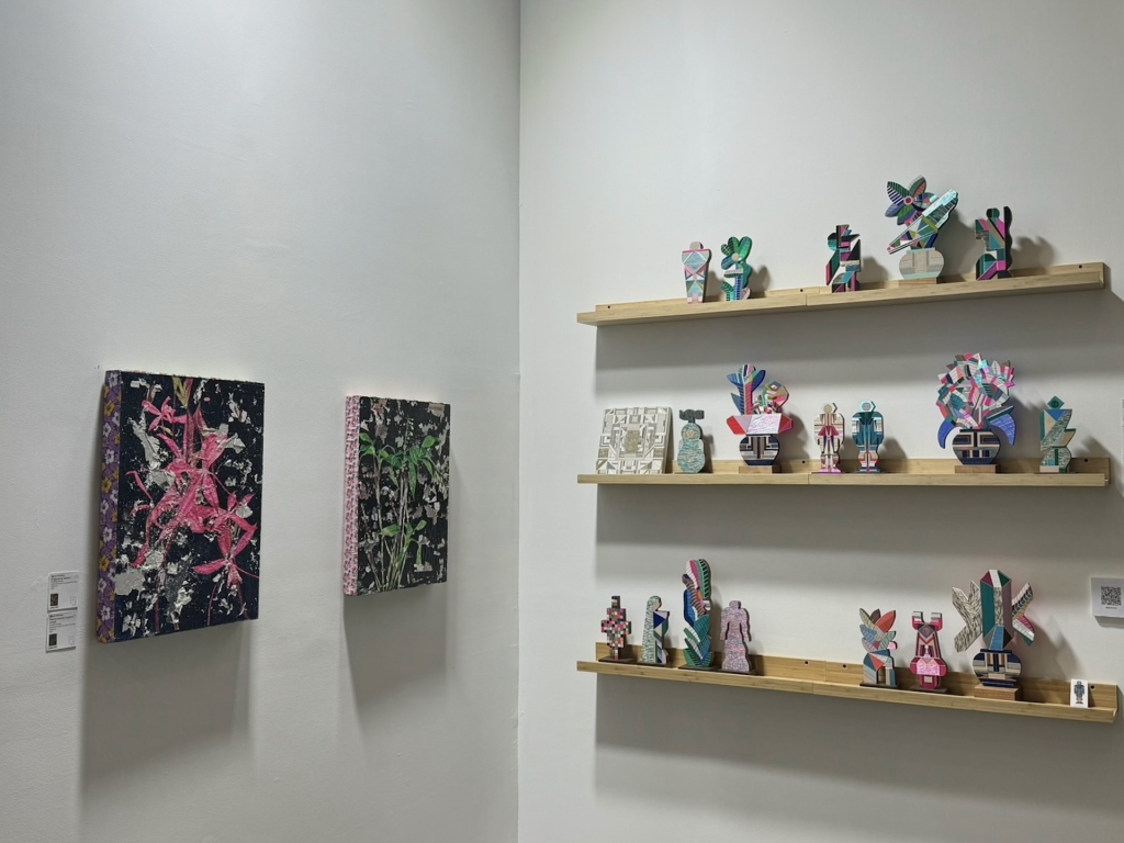 十方藝術空間於雅加達藝博會展出多位臺灣與國際藝術家的作品,延續過去跨文化與在地對話的策展方向。帶來臺灣藝術家張宇銜以蝙蝠與聖堂圖像建構自我敘事,倪瑞宏則展出陶瓷彩繪作品;泰雅族藝術家Yabun Yuma以原住民女性獵人視角,將獵槍擊發顏料,創作《Bully Hole》系列,回應狩獵文化與身份議題。另有日本藝術家中田慎吾(Shingo Nakata)以「水引線」探索時間與空間邊界,印尼藝術家瓦尤・阿丁(Wahyu “Adin” Wiedyardini)則以圖像與版素交織呈現文化記憶。今年十方藝術空間的展位設計較去年更成熟,動線與陳列清晰,觀眾停留更久。同時延續永續策展理念,運用線上展示與AR模擬,試圖減少實體包材與運輸浪費。