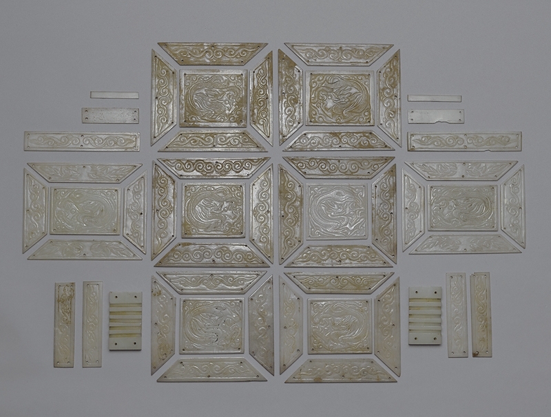 國立故宮博物院此次借展還特別派出了兩件國寶級文物助陣,分別是北宋〈真宗禪地祇玉冊玉匱嵌片〉、宋、遼〈玉龍紋盤〉。北宋〈真宗禪地祇玉冊玉匱嵌片〉是裝盛北宋真宗皇帝於大中祥符元年(1008)舉行禪禮所用玉冊的箱盒裝飾,由52片玉嵌片組成,嵌片上主要為龍紋與雲紋,某些玉片上雕琢有成對翔鳳紋,為研究北宋政治與藝術風格的重要依據。宋、遼〈玉龍紋盤〉盤正面飾行龍紋,身軀似飄帶般彎曲翻轉,平面起伏有致,全身滿覆細鱗,鱗上並陰刻細線紋,同時巧匠運用鏤空與雙面雕技巧,使體積大而色澤深沉的玉盤變為輕盈靈巧。
