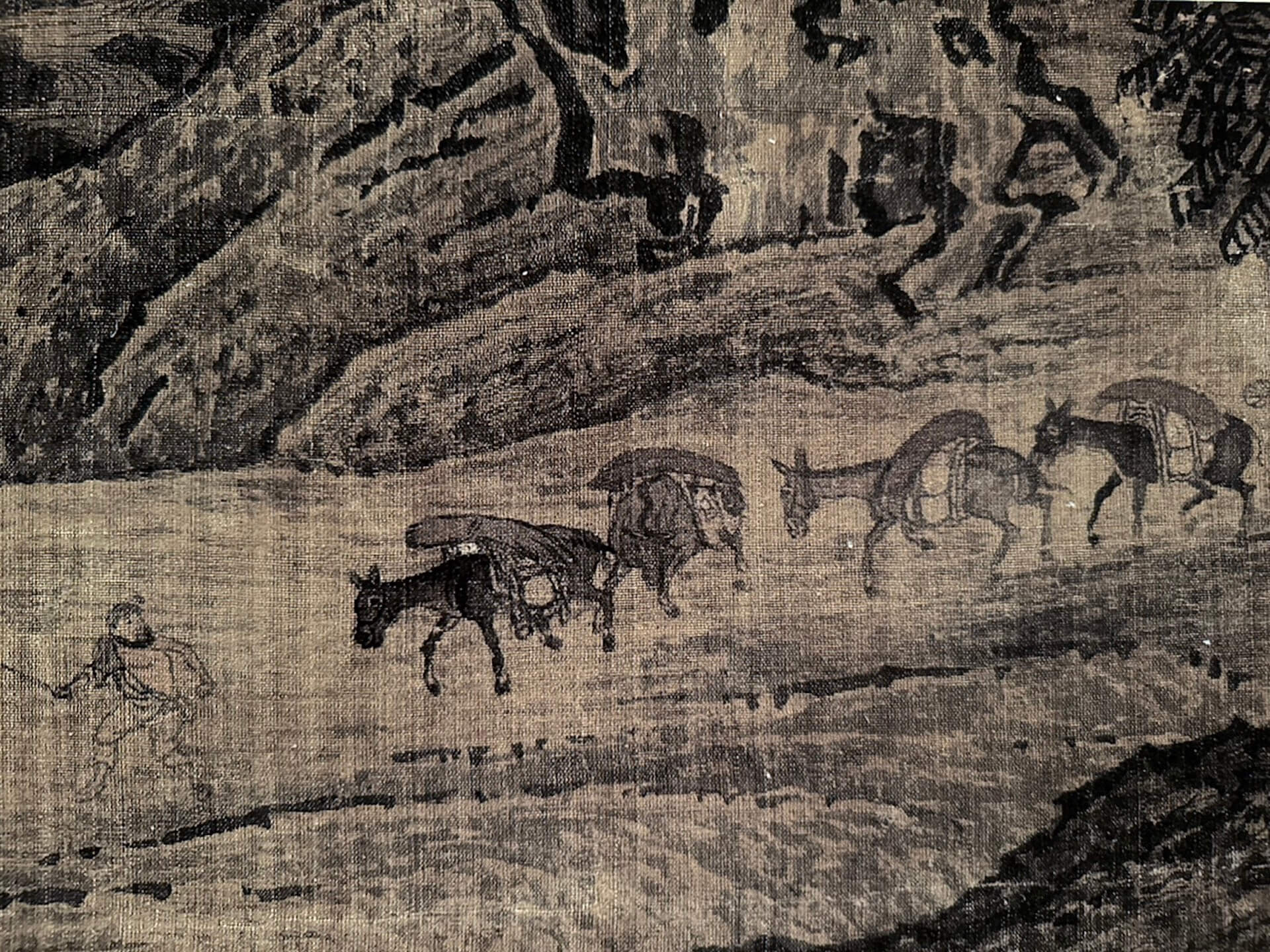 筆下崇山峻嶺的壯闊,展現天地大觀的氣勢。山體布滿許多細密短皴,宛若天空傾瀉而降的雨滴,後來的人稱為「雨點皴」,是范寬風格的重要標識。右下角是行旅的商隊,商人一前一後,正催促馱負物品的驢群前進,人物在畫中雖渺小不易看見,但的確點出「谿山行旅」的主題。1958年,副院長李霖燦與技工牛性群在該畫右下處騾隊後方樹叢中發現有「范寬」二字,足證明代董其昌所題:「北宋范中立谿山行旅圖」,至此谿山行旅圖為范寬所繪已殆無疑義。