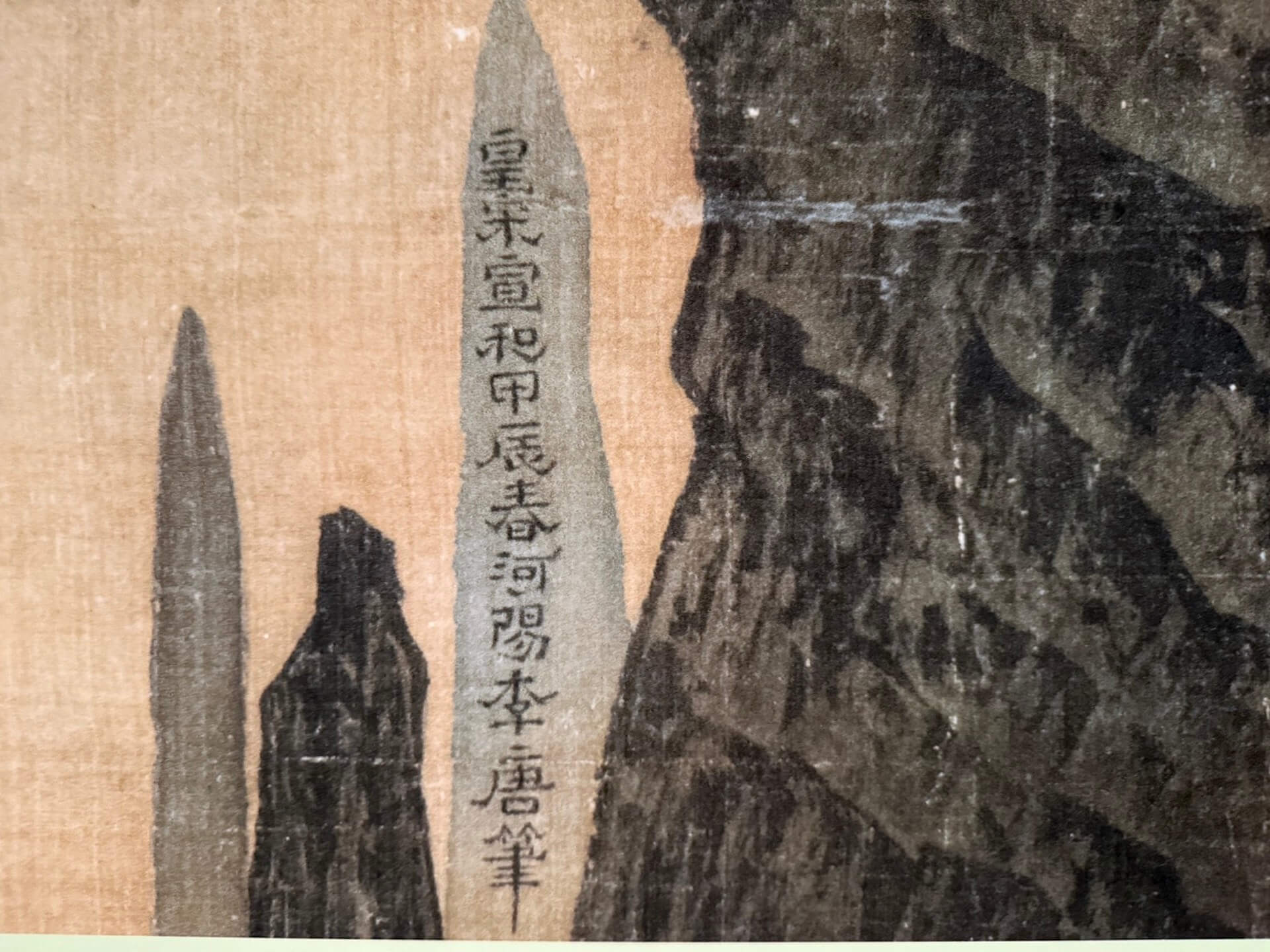 則以斧劈剛勁筆法,開創承先啟後的山水風貌。〈萬壑松風〉和〈早春圖〉一樣,是一件作者與製作年代都清楚的珍貴早期山水鉅作。畫中主峰左側尖峭的淡藍色遠山上,留有「皇宋宣和甲辰(1124)春。河陽李唐筆」隸書簽款。