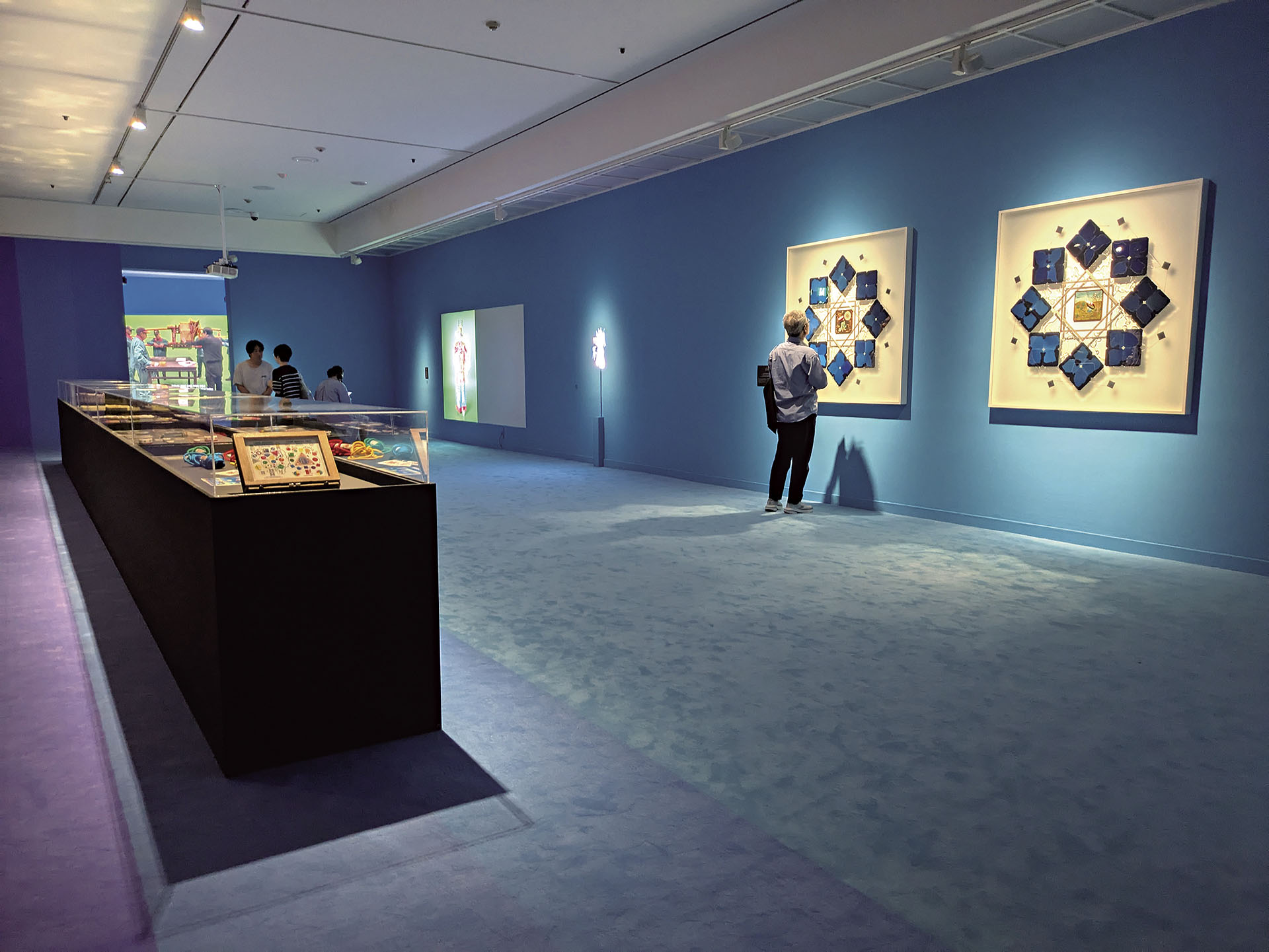 這樣的策略也具體轉化為觀展體驗,展場設計刻意扭轉美術館的「白盒子」形象,營造出更具沉浸感與氛圍感的環境,在展廳入口處使用黑色布幔作為區隔外部世界與展覽內部空間的界線,色彩的運用也不只是純粹的美學考量,而被視為一種「能量場」,意圖在對觀者產生心理乃至生理層面的影響。