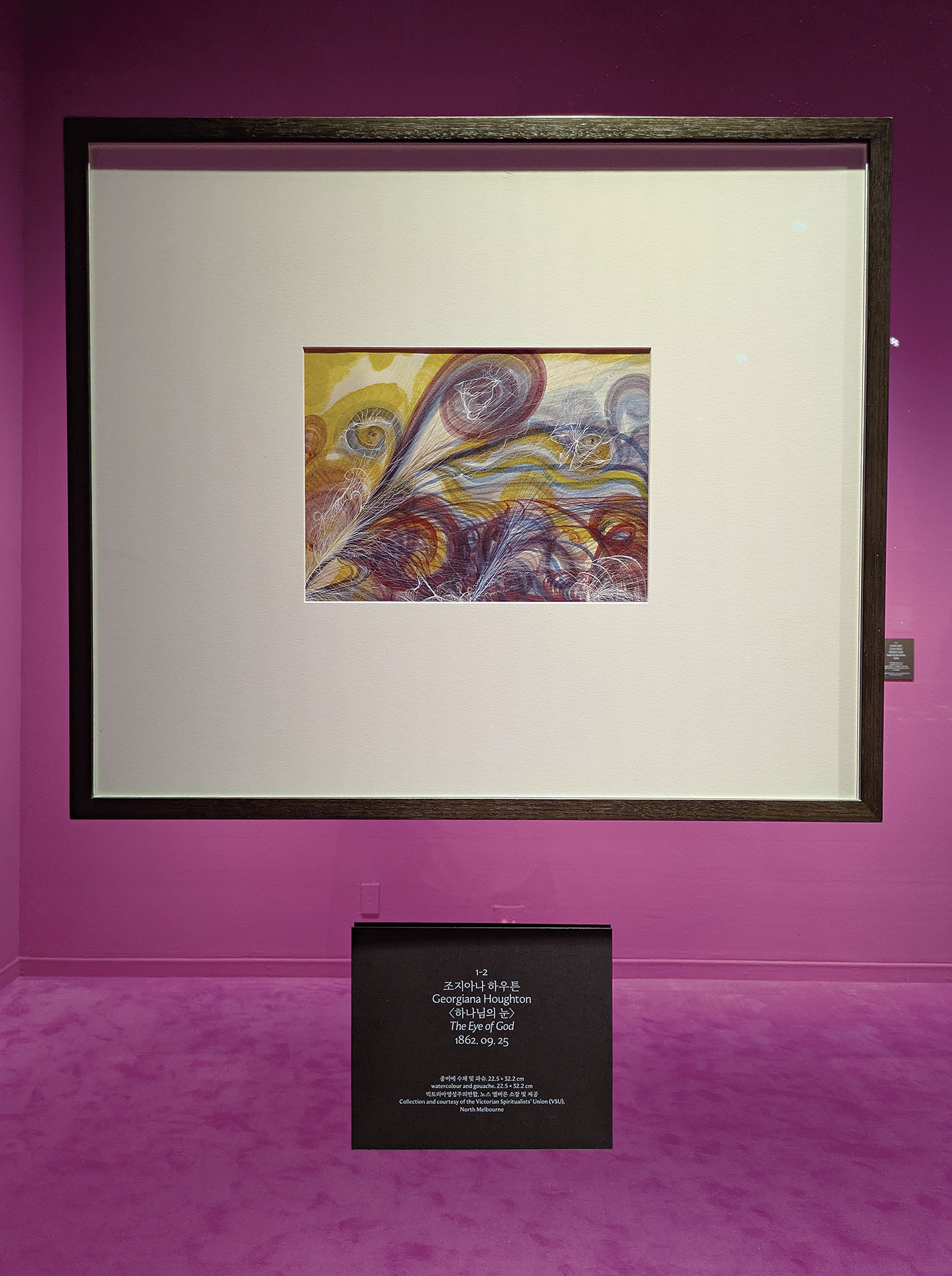 霍頓此次展出的系列繪畫,皆是在她接觸通靈之後,透過一連串「附身儀式」所完成;而展出一系列陶碗的出口王仁三郎(Onisaburo Deguchi)則是19世紀末日本新興宗教「大本教」的創始人。策展人將這些作品視為現代主義中一條被壓抑的系譜,其根源在於通靈溝通、女性直覺以及非西方的宇宙觀。將這些創作置於展覽開端,也象徵對藝術史長期由男性主導、崇尚理性與科學的現代主義傳統的一種批判。
