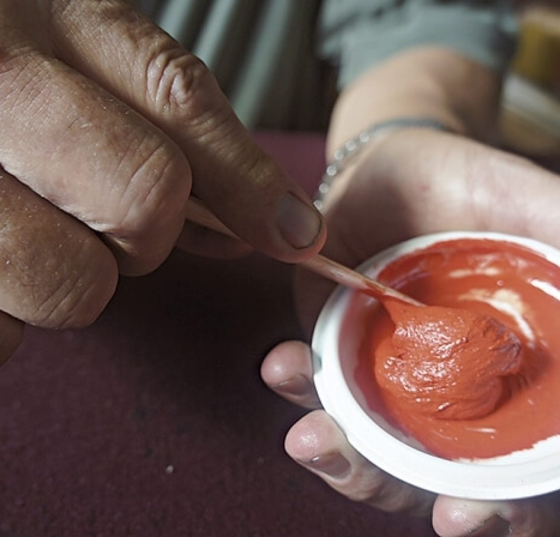 印泥之砂體易下沉,油性易上浮,需常用骨簽翻調使之勻和。順著一個方向上下翻調,不可切割、打轉式的翻調。