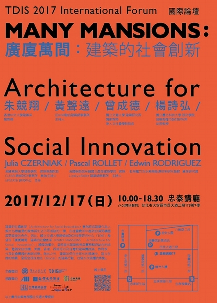 國立交通大學跨領域設計科學研究中心(TDIS)將於12月17日、在台北忠泰講廳舉行「廣廈萬間:建築的社會創新(MANY MANSIONS:Architecture for Social Innovation)」國際論壇。「建築的社會創新」意指相信建築作為人類文化最重要的象徵與生活不可或缺的一環,在社會變革中應該扮演更積極與更直接的角色。因此,TDIS希望在「廣廈萬間:建築的社會創新」國際論壇中,呈現當代建築教育與實務緊密結合的成果。邀請來自法國、美國、香港以及台灣的建築實踐者、教育家,分享社會實踐的創新成果。除此之外,建築如何在全球化的風潮中,建立在地的特質,呈現全球在地化(Glocal)的建築行動,也是本次論壇的焦點。