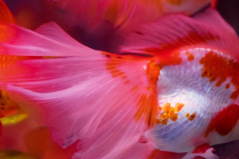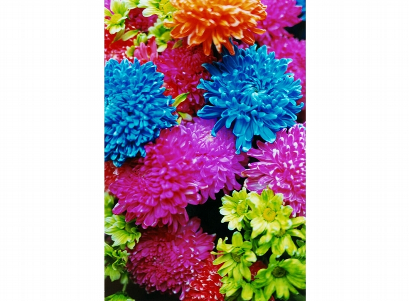 同樣的,將拍攝主體距離近到僅剩局部,成為由肆意揮灑色彩構成介於現實與夢幻之間的綺麗場景,這些蜷川實花喜愛的素材選擇,卻有不止於視覺感官好感的背後意涵,例如非自然所生的金魚,不斷被改變基因、變色轉形,存在純粹為了調劑人類的生活情趣,甚至是在水中搖曳生姿的分岔尾巴,也都是源由自基因突變的美麗錯誤;又或是為符合消費者多樣化顏色之需求,以不同染料進行染色的菊花成為栽培者增加收入的來源,透過染色技術,平凡無奇的白色菊花,就能成為五顏六色、色彩豔麗的彩色花卉,因而,蜷川實花其實關注這些為了人類慾望而被改造的自然界物種,但比起衛道批判,她更希望能夠單純地把這些現象與美麗的生存狀態呈現出來。