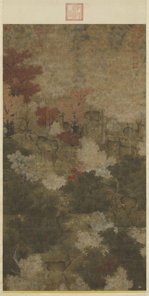 五代〈秋林群鹿〉軸,國立故宮博物院藏。圖片提供:國立故宮博物院