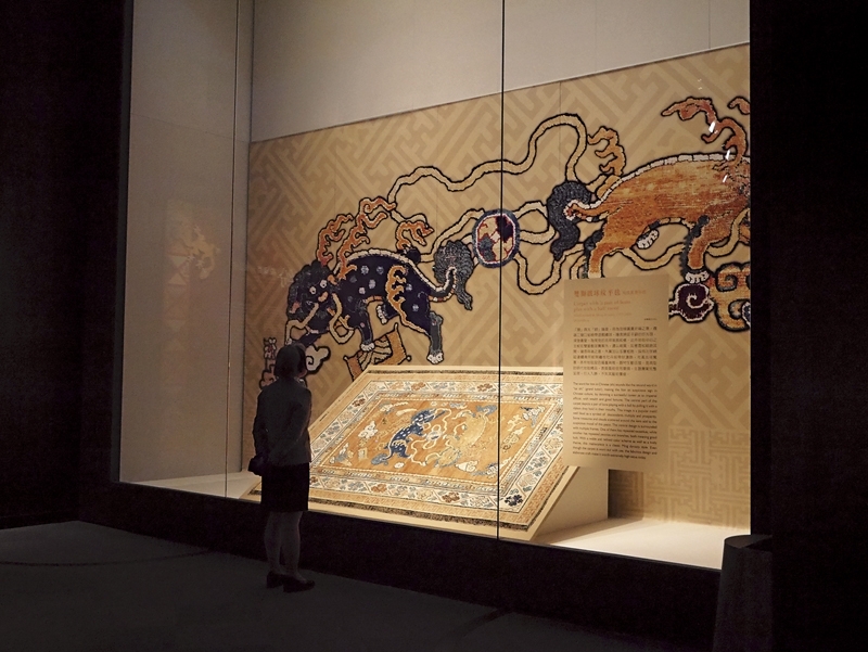「錦繡繽紛―院藏亞洲織品展」展覽現場,圖中為明代〈雙獅戲球紋平毯〉。攝影/林宛萱。