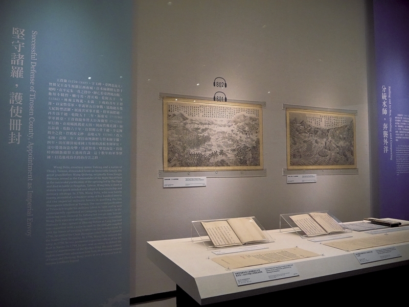 「王得祿與同安船特展」展覽現場,牆上右側者為清乾隆朝《平定臺灣戰圖》〈生擒莊大田圖〉,左側為《平定臺灣戰圖》〈諸羅解圍圖〉。攝影/林宛萱。