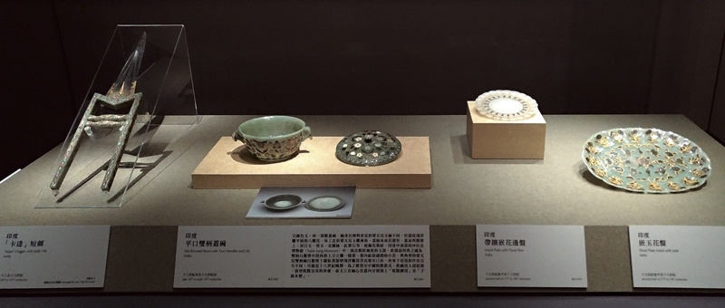 印度玉器有著華麗的裝飾風格,左起:〈「卡達」短劍〉、〈平口雙柄蓋碗〉、〈帶鑲嵌花邊盤〉、〈嵌玉花盤〉。攝影︱林容伊