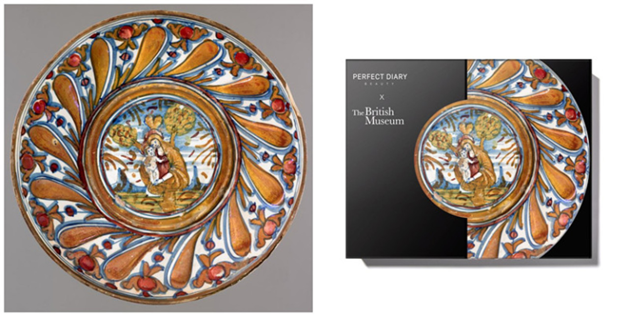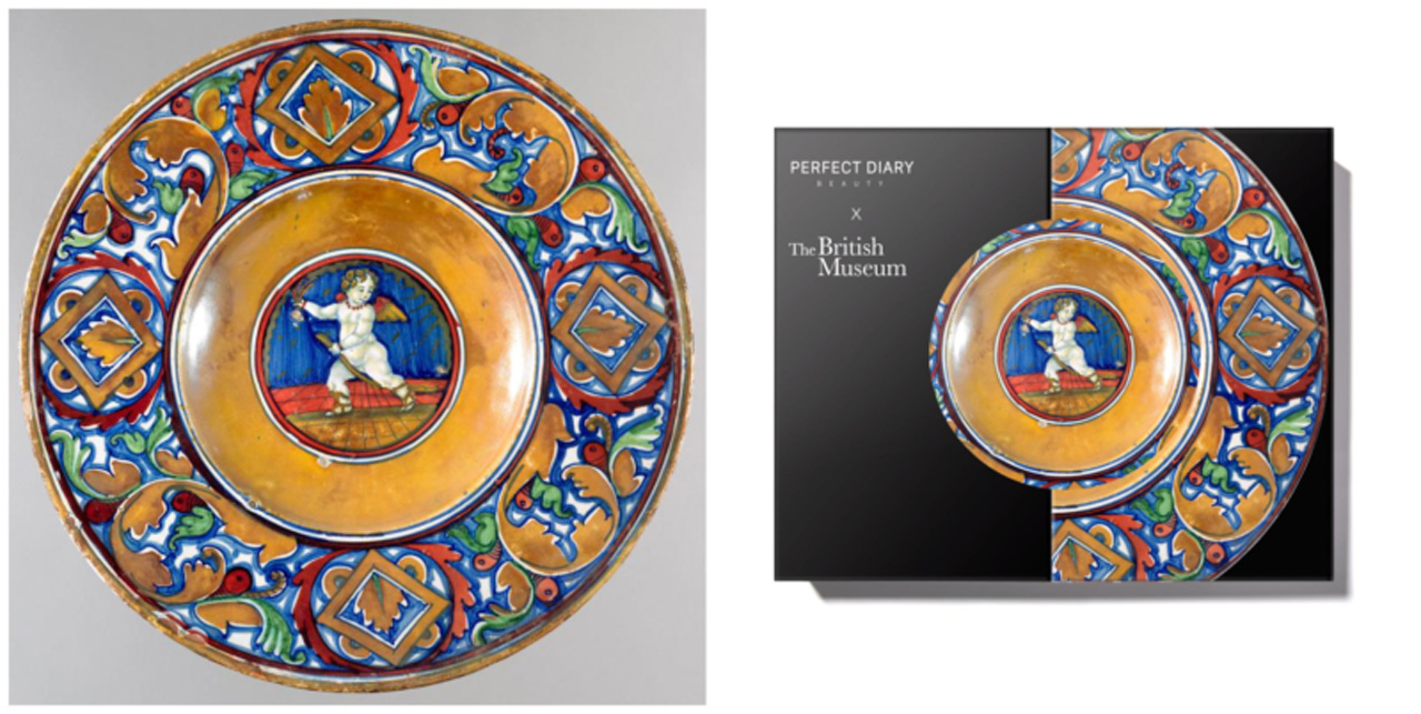 2018年,北京故宮博物院文化創意館推出「故宮國寶色」六色口紅以及「故宮美人面膜」,吹起一股博物館彩妝熱潮。在2019年,中國彩妝品牌完美日記看準這股熱潮,聯手大英博物館於該年雙11推出愛神丘比特和聖母瑪利亞眼影盤,古典與時尚並存、文藝氣息濃厚的十六色眼影盤,締造預售即售出逾10萬件的佳績。聯名眼影盤的設計靈感源自於大英博物館知名藏品馬約里卡陶盤,馬約里卡陶盤是由追求極致的色彩與光澤的理念彩釉匠人,在倡導打破束縛,每個人都可以享受和表達美的人文藝術氛圍中打磨而成。16色眼影盤專門定制了兩個色號,其中01號眼影盤,選用的是丘比特盤(館藏編號:1851,1201.5,年份1520-1530 ),以蜜桃色為基調,C位色選用丘比特陶盤的背景色寶石藍,古今融合的效果,讓有彩妝需求的民眾,入手後就可以隨心所欲的穿越時空。