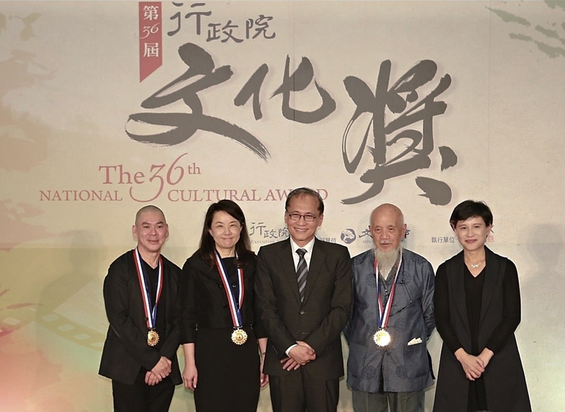 第36屆行政院文化獎由行政院長林全(中)頒發,得獎者劉國松由其女劉令徽代表(左二)、鄭善禧(右二)、蔡明亮(左一),與文化部長鄭麗君合影。圖/行政院文化部。
