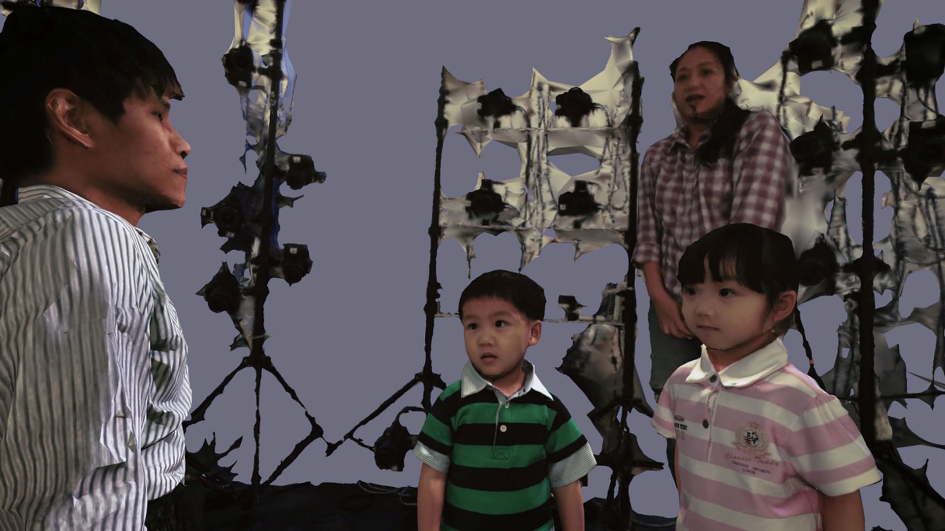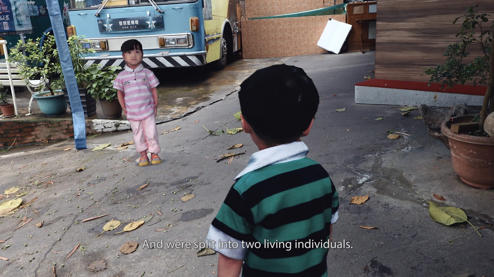1979年,忠仁忠義兄弟三歲,在台灣接受連體嬰分割手術,手術歷時十二個小時,全程於電視直播。在這不尋常的媒體宣傳過程與時空背景裡,手術成為各種社會與政治象徵。當年為了分割手術練習,臺大醫院邀請了藝術家謝孝德,試圖將連體嬰的身體翻模,提供給手術醫生進行練習。然而因嬰兒不受控制,人體翻模失敗了,只能以泥塑方式完成雕塑。在這件作品〈副本人〉中,我重新翻模了四十三歲的張忠義身體,再使用3D掃描技術建立身體檔案,並以這些檔案為素材,拍攝了他年輕的過往記憶。