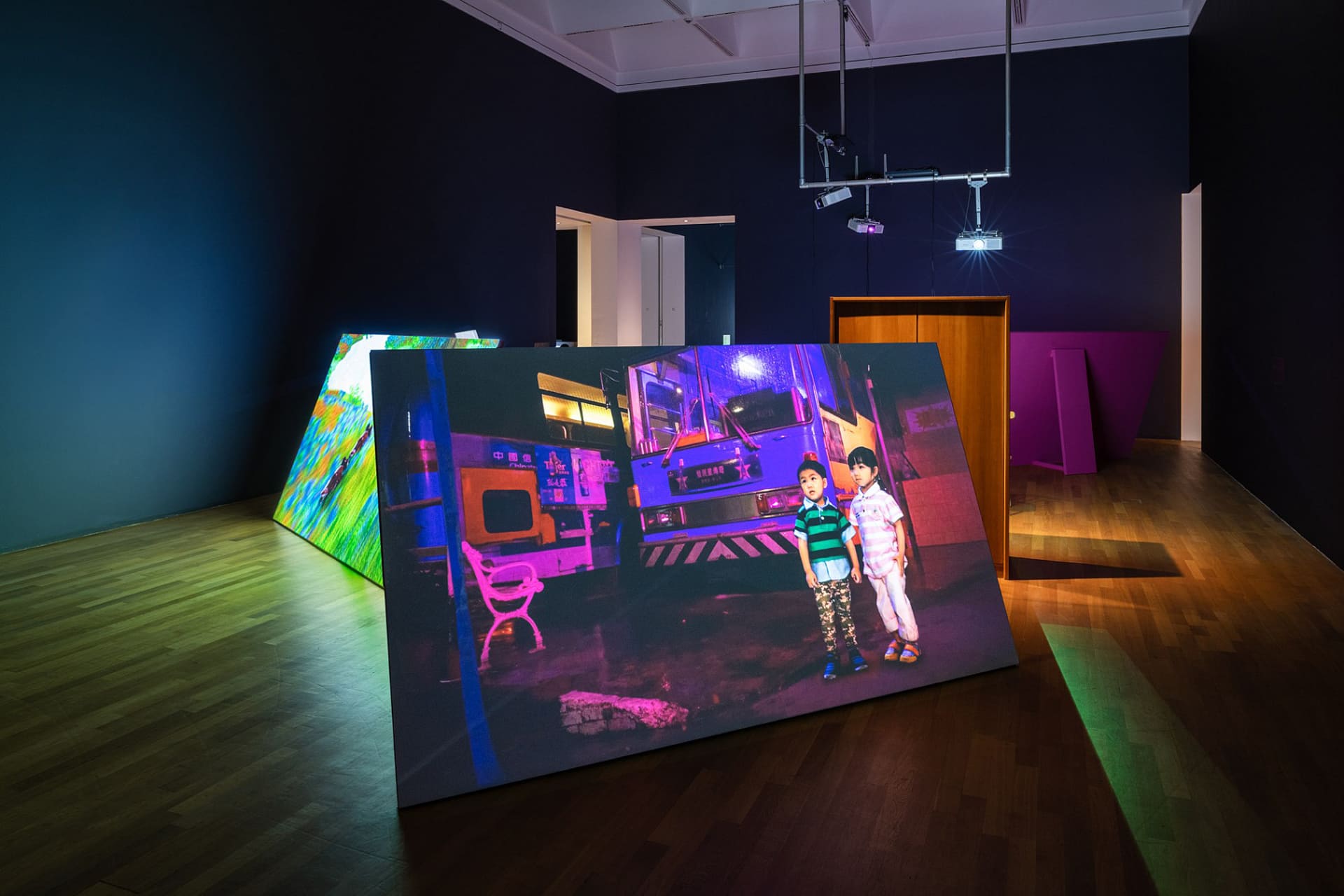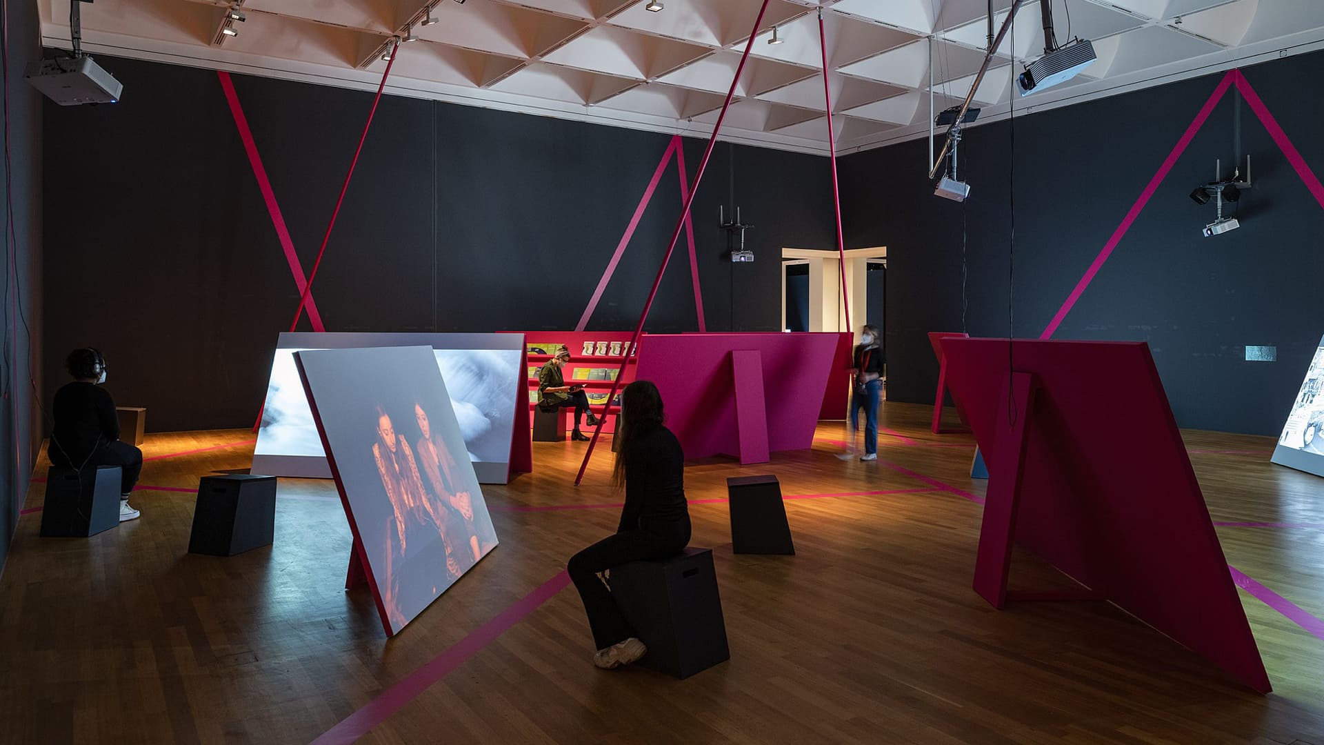 另外,有別於其他國際影展,「Videonale」本就不循電影院放映模式,而是藉由一大型展覽的構建,共商時基藝術於暫時性的白盒子空間內的展陳可能性。雙年展自2005起,開始與波昂美術館合作,移至該館展出後,館內800平方公尺的展示空間也使其成為世界上最大的錄像藝術展覽之一。但偌大的建築結構體與展覽空間結構需經轉譯,方能更適合錄像藝術的映演,於是「Videonale」該年也立即確立了每屆邀請建築師或場景設計師進行整體空間規劃設計的傳統,強調入選作品在其中個別展出之餘,遙香對話的重要性。今年則由柏林馬茲坎特建築事務所(maaskant Berlin)的建築師露絲.羅倫茲(Ruth Lorenz),為「Videonale 18」打造一可乘載世界現況下的複雜敘事的空間,且試圖彰顯錄像藝術媒介特質的流動性,回應展覽主題。