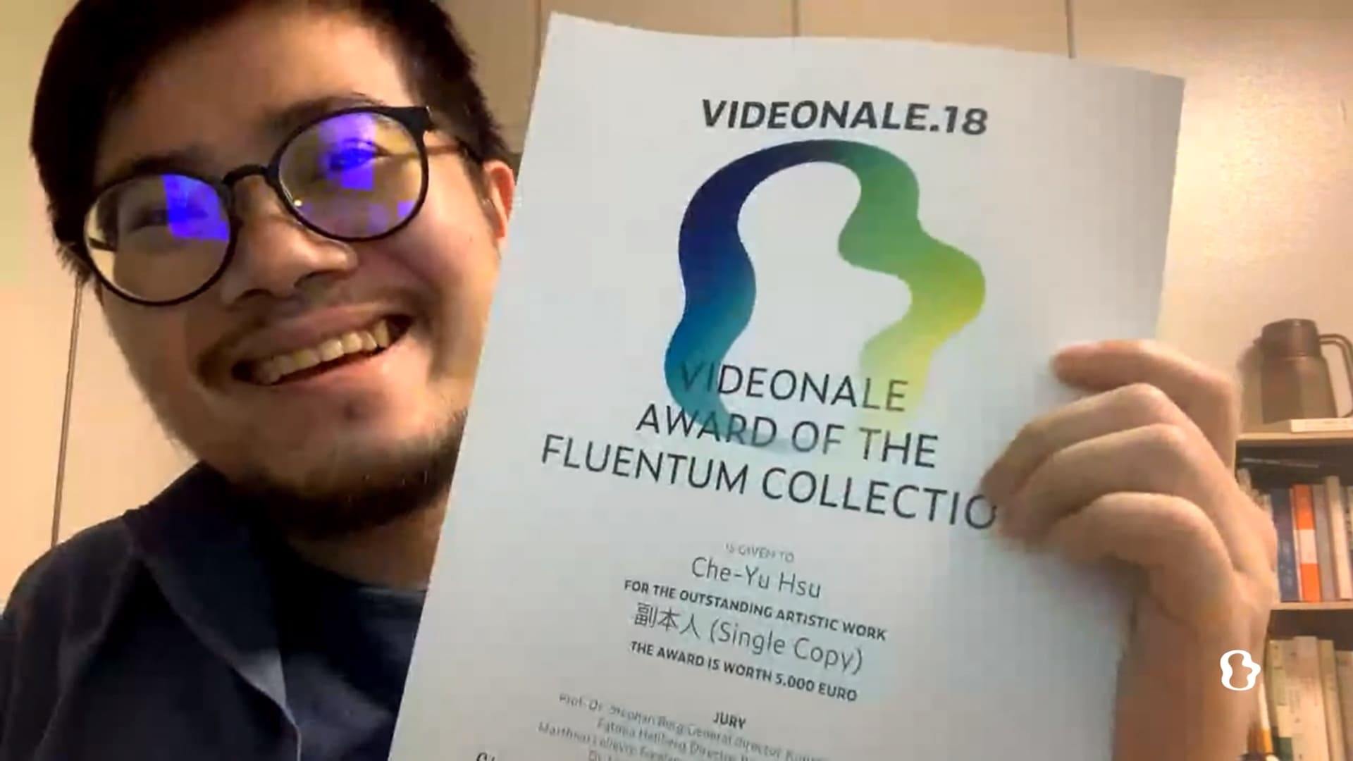 許哲瑜從2019年入圍「HUGO BOSS亞洲新銳藝術家大獎」、去年獲得「LOOP錄像藝術製作獎」,再至今年於「Videonale 18」中掄元,屢屢獲得國際重要藝術獎項肯定。他也在臺灣的工作室中,透過遠端視訊連線,同步參與了本屆線上頒獎典禮,表示非常高興得以獲獎,遺憾無法親赴波恩與大家見面、共飲,在感謝評審團之餘,也為不久的未來祈願。各自在家的評審與位於波昂美術館現場的工作人員在他致詞完後,一同舉杯向他祝賀,後並於線上播映《副本人》全片。
