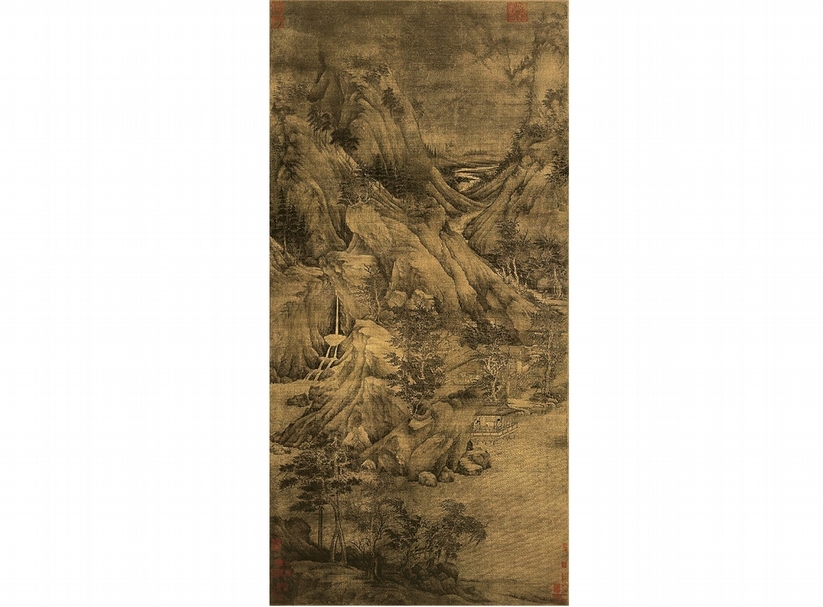 〈溪岸圖〉上有南唐著名宮廷畫家董源的簽款,此畫雖屢經藝術大師收藏,卻也因此產生身世之謎。紐約大都會亞洲藝術部主席何慕文(Maxwell K. Hearn)曾於1999年編著圖錄《溪岸行(Along the Riverbank)》介紹此畫,加州大學柏克萊分校教授高居翰(James Cahill,1926~2014)卻認為此畫為張大千的偽作,在學術界引發熱烈討論。大都會博物館為此召開學術研討會,邀請國際學者論壇此畫真偽,並出版論文集《中國畫的鑑定問題》(Issues of Authenticity in Chinese Painting)。如今學界大多認同此畫雖不一定為董源真跡,卻是10世紀的重要山水畫作品。圖中被大山大水包圍的亭中居士與其妻、子,更呈現了隱逸生活的理想面貌。
