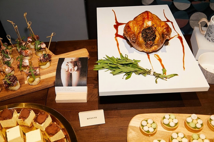 「裸:泰德美術館典藏大展」台北記者會現場,以食物向此次參展作品莎拉.盧卡斯(Sarah Lucas)《小雞內褲》(Chicken Knickers)致敬,別具巧思。(高雄市立美術館提供)