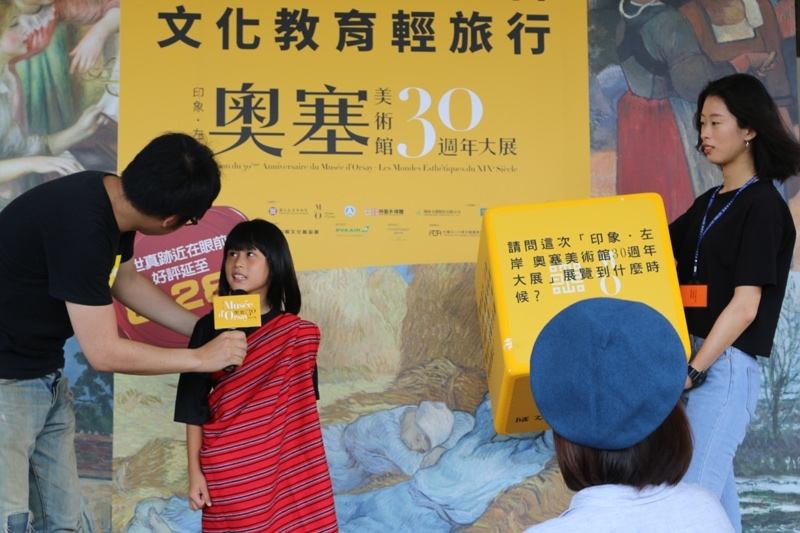 14日舉辦的文化輕旅行記者會上桃山國小的師生們前往故宮正館及「印象.左岸-奧塞美術館30周年大展」參觀,在記者會上國立故宮博物院副院長李靜慧與教育部主任秘書陳雪玉,戴著畫家帽,以畫家的身分出現與小朋友互動,並透過有獎徵答的方式,讓小朋友能更加瞭解此次展覽的內容。