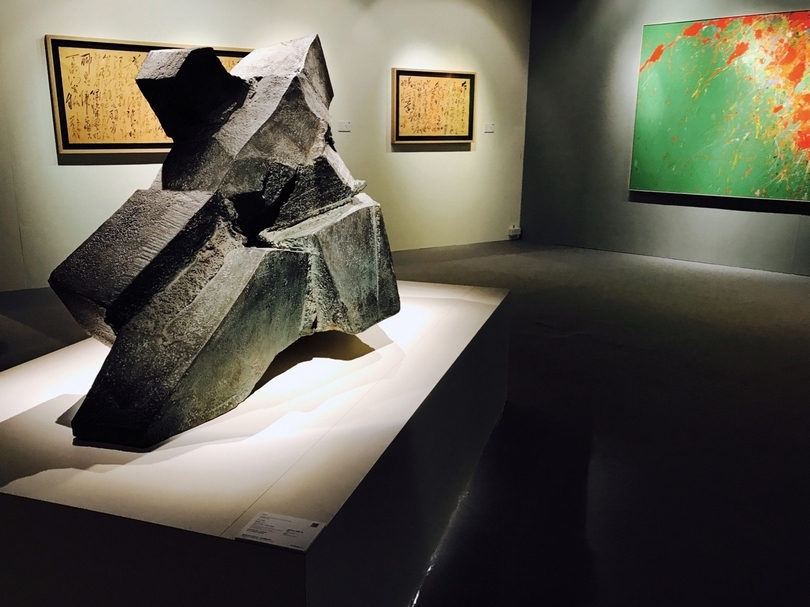 朱銘的「太極系列」與丁雄泉的《紅艷似火》(右後方),兩件作品皆拍出漂亮成績。(攝影/陳意華)