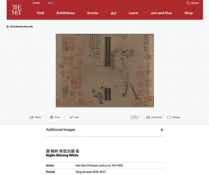 美國大都會藝術博物館官方網頁,以館藏唐韓幹〈照夜白〉為例,除提供詳實的文物尺寸、材質、時代及來源等基本資訊,圖片下方有一「download」鍵,點選後即可下載高解析圖檔。圖/擷取自美國大都會藝術博物館官網。