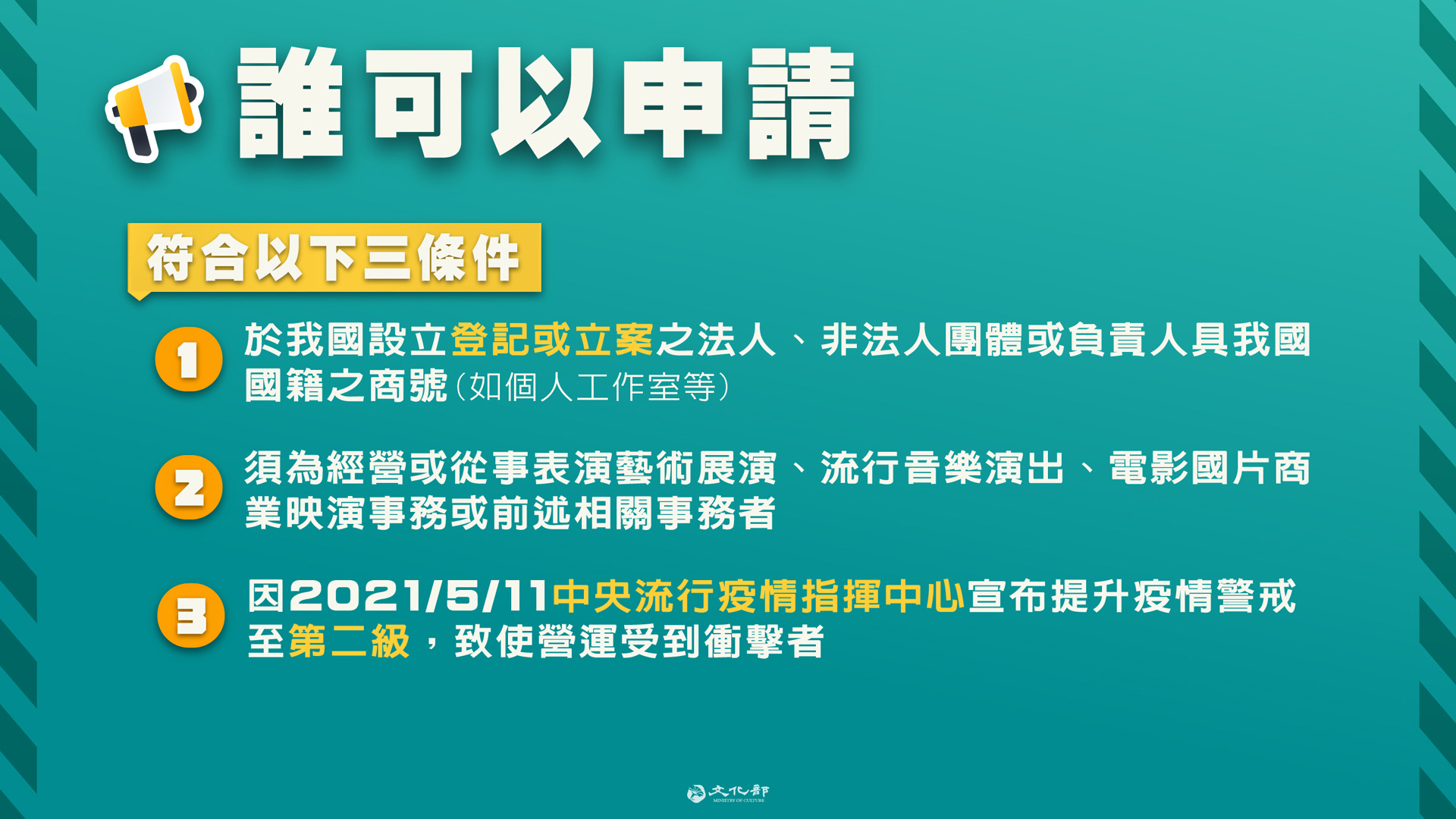 文化部表示,本次申請是針對2021年5月11日起至6月8日舉辦的國內表演藝術團隊展演活動、我國表演人演出之流行音樂公開售票演唱會及電影國片商業映演等進行補助,符合條件且為我國設立登記或立案之法人、非法人團體或是負責人具我國國籍的商號,都可以提出申請。