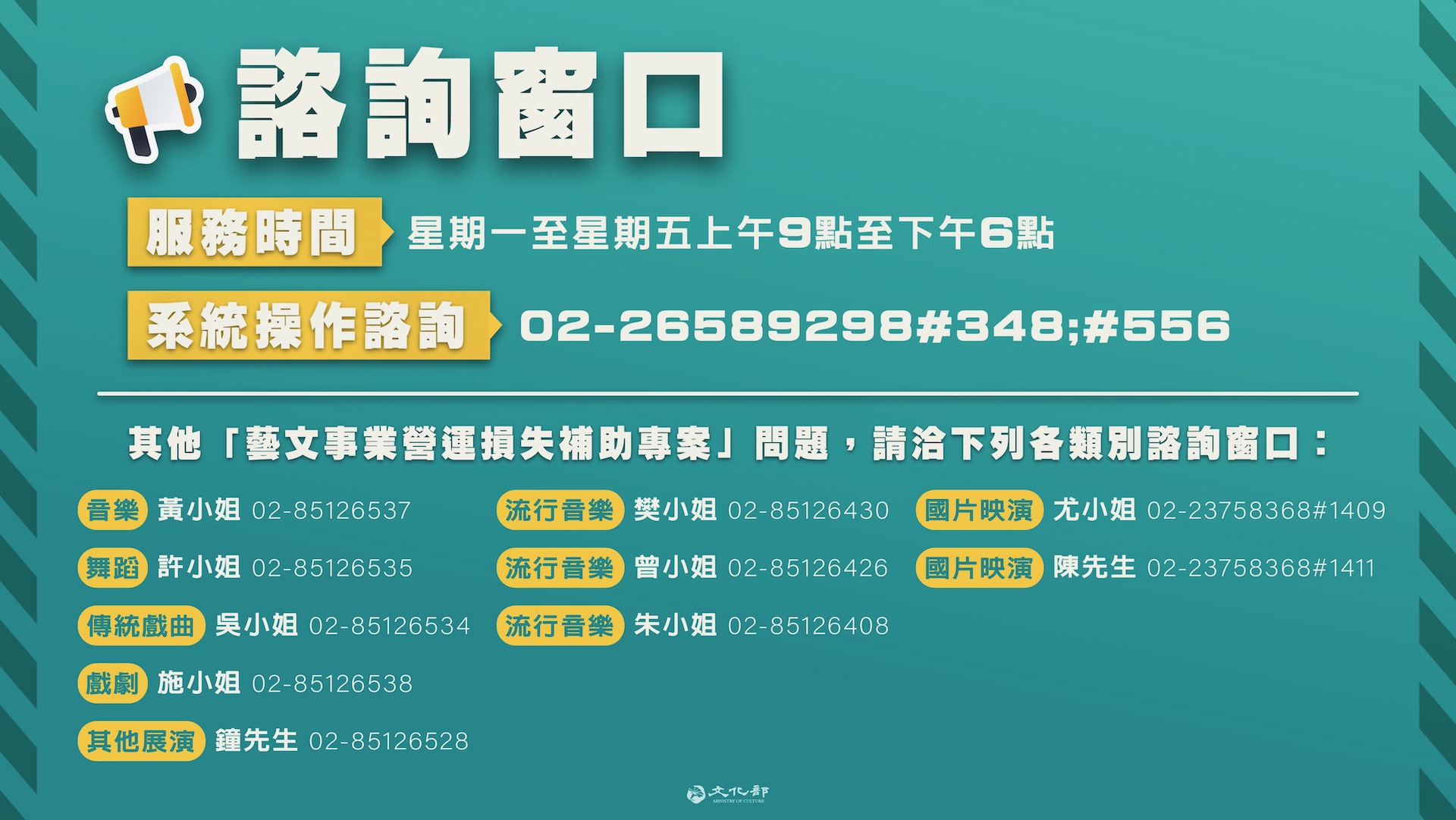 有鑒於中央流行疫情指揮中心於11、15日陸續宣布提升疫情警戒標準及因應事項,文化部於14日下午首先公布「藝文事業營運損失補助專案申請須知」,並於今(17)日公告線上申請系統正式啟用。「藝文團隊或個人工作室」在5月11日至6月8日間,所舉辦的「展演」及「映演」活動,因受防疫措施影響的損失,都可以進行申請。補助最高額度以250萬元為上限,但申請者遇有重大特殊或緊急情況,經審查小組及文化部審認者,不在此限。申請雖可採線上、郵寄或親送等3種方式,但為防疫考量,且審查將採「先到先審」方式,文化部鼓勵優先採用線上申請方式,申請時間自即日起至6月17日23時59分止。