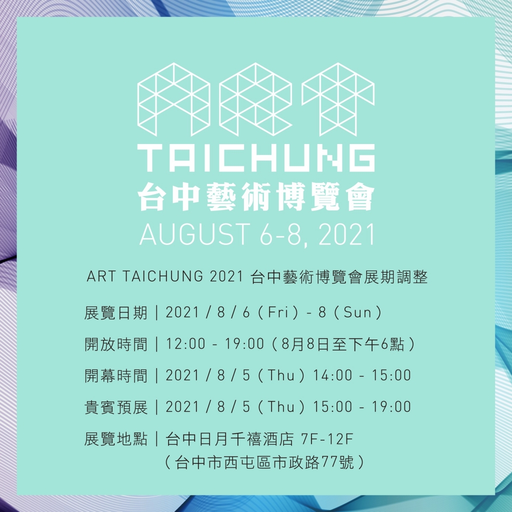 第9屆「2021 ART TAICHUNG台中藝術博覽會」原訂於7月16至18日(15日為VIP預展),將於台中日月千禧酒店盛大登場,因國內疫情嚴峻,今(21)日宣布延期至8月6日至8月8日(8月5日為VIP預展)。
