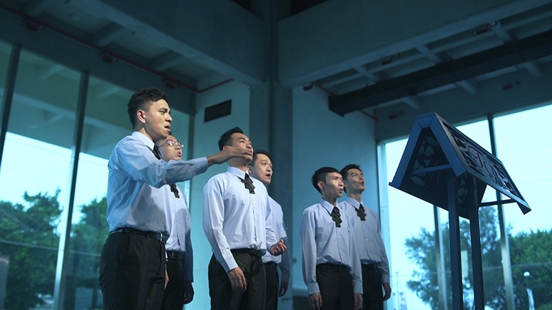 余政達,〈台北雙年展之歌〉,2016,單頻道影像裝置,作曲家:洪敦遠,歌手:黃世雄、林義偉、姜佑融、廖文瑞、林政勛、彭志宇,製作人:丁肇輝,攝影統籌:林眾甫,燈光師:王子碩,剪接調光師:白欣田,聲音設計:晟