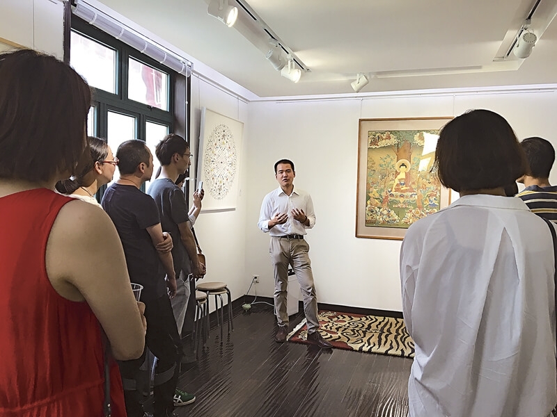 整場活動分三個部分,來賓首先參觀空間展出的唐卡,其次品嘗藏式優酪乳,最後在抄寫佛經的體驗中結束。活動由醍醐聯合創辦人張俊彥主持,他為參觀者依次介紹每一幅唐卡,包括畫中呈現的宗教形象、圖像含義、畫風畫派以及創作者繪製唐卡的生命歷程。空間共展出12幅唐卡畫作,其中傳統唐卡九幅,融合現代藝術形式創作的唐卡有三幅。創作者包含德高望重的藏族唐卡畫師、年輕但功力扎實的青年畫師,還有海外先鋒的當代藝術家。在詳盡的講解之後,現場氛圍變得輕鬆。工作人員將藏式優酪乳分給參觀者,大家一邊品嘗,一邊互相交流感受。之後是抄寫佛經的體驗環節。參觀者在宣紙上用毛筆臨摹玄奘譯本《心經》,在專注靜心地書寫中體驗修行給身心帶來的平和感。此後,醍醐上海藝術空間會陸續舉辦開放日活動,在盛夏之際為滬上帶來一縷清涼的雪域高原藝術之風。