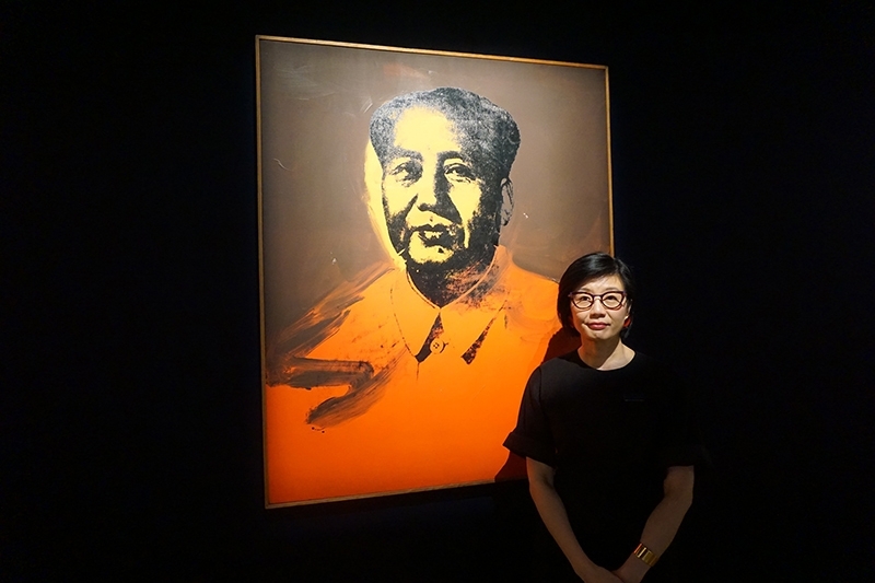香港蘇富比當代亞洲藝術部主管林家如,與沃荷《毛主席》作品。(攝影:林亞偉)
