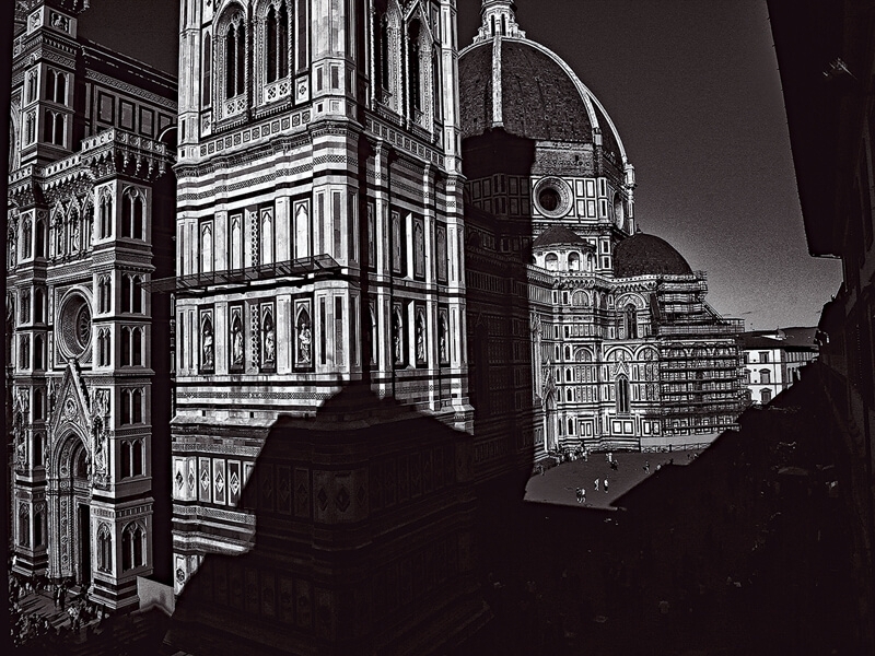 甫進易雅居,即可見到寬闊牆面上放置著選自《記錄:No.19(義大利)》攝影集中拍攝義大利機場的照片,隨興捕捉的畫面中暗含著森山大道對這個城市充滿魅惑的想像。從一樓樓梯走道延伸到地下室的空間皆為在義大利拍攝的作品,包含佛羅倫斯的橋、波隆納的車站等標誌性符號皆可在此看到,輔以易雅居代理的義大利家具陳設,讓人一進空間即感受到濃厚的「義式風情」。