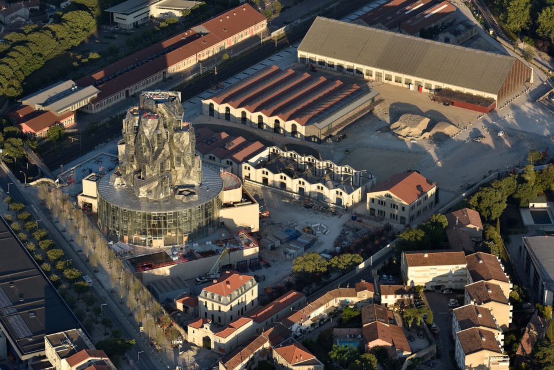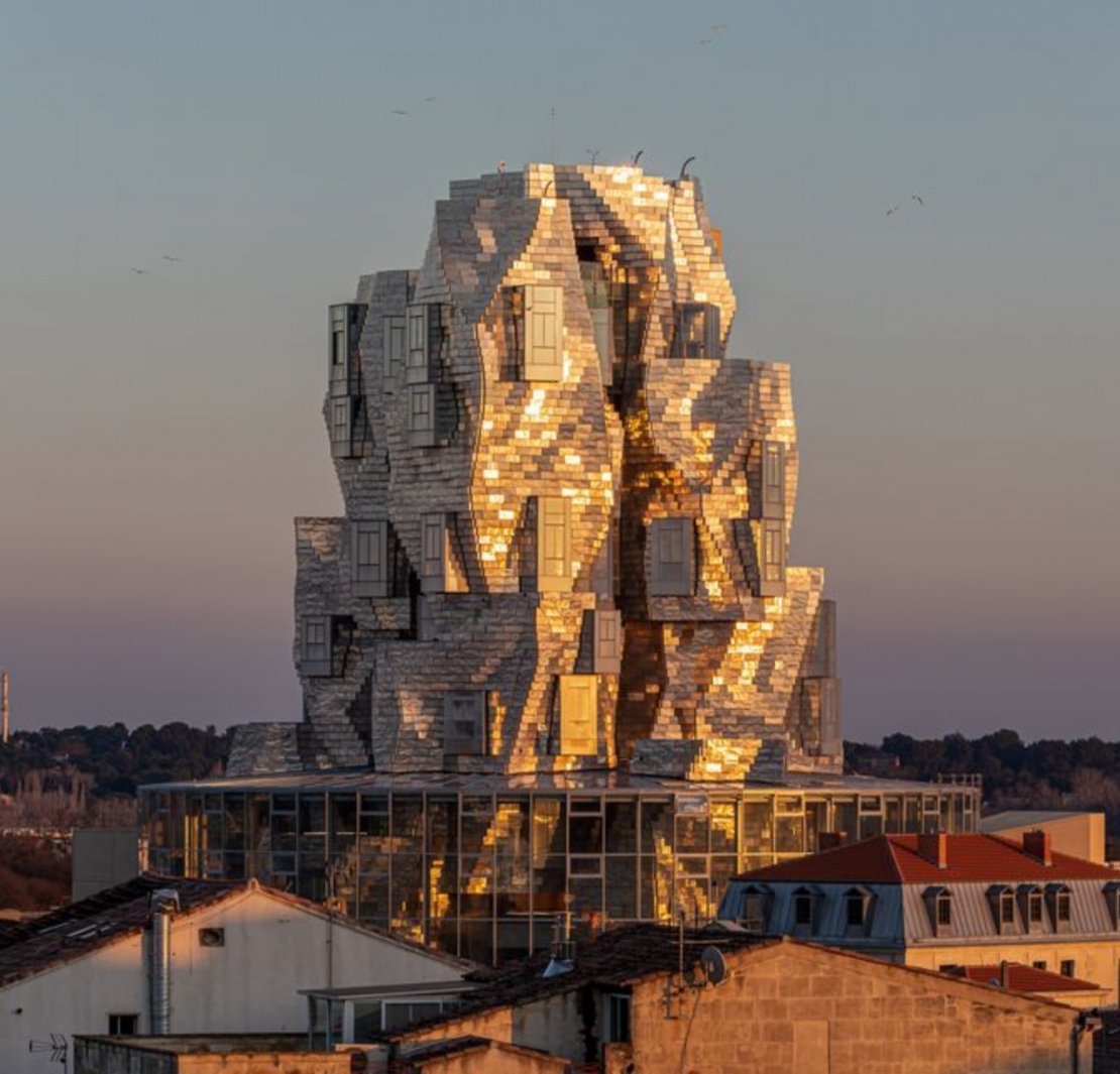 Luma Arles當代藝術實驗中心的塔樓建築高約56米,本體表面由1.1萬塊閃閃發光的面板組成,白天可反射藍天,而夜間,鋸齒狀立面的窗戶可被照亮。這棟建築的設計來源於梵谷的《星夜》(1889 年)。高齡92歲的建築師蓋瑞提到:「這是我設計的第一座羅馬式建築,整個參與的過程是一段漫長而又十分鼓舞人心的旅程。最後,我也未我和霍夫曼共同創造的食物感到十分自豪。」除塔樓外,該場地還包括由比利時 Bas Smets 和 Parc des Ateliers 建造的人工湖的景觀公園,該公園以前是法國 SNCF 國家鐵路公司的工業用地,由 Selldorf Architects 翻新。