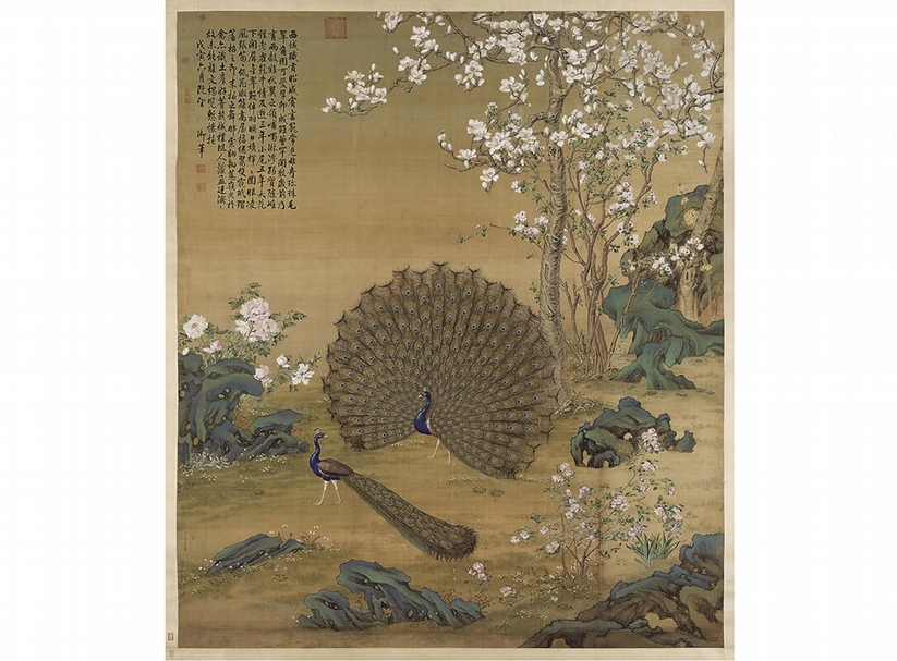 郎世寧〈畫孔雀開屏〉,國立故宮博物院藏。