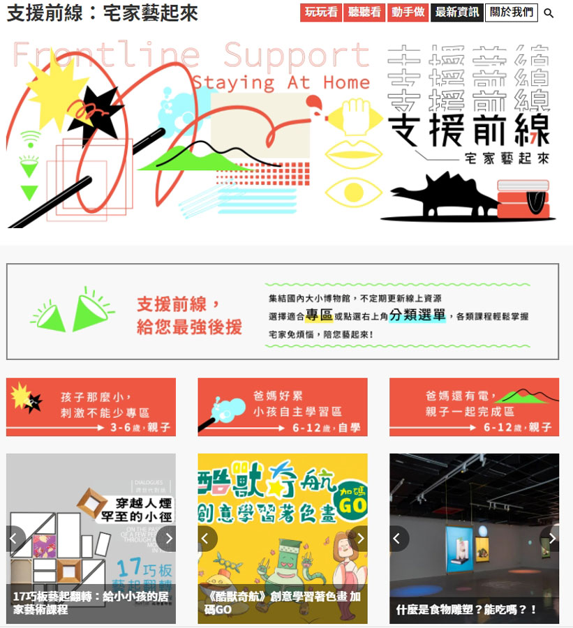 隨著第三級防疫警戒接連延長,孩子在家的時間變多,家長陪伴與教育的責任加重,博物館及美術館也想在這個時間點以不同的形式和孩子、家長保持互動。因應疫情期間閉館的限制,各級美術館、博物館也及時將展覽、典藏等相關素材調整成親子共學或是兒童自學的線上資源,成立「支援前線─宅家藝起來」,串聯國內大小博物館/美術館,提供各館專為3-12歲的兒童開發的相關線上資源,讓不能到館的觀眾也可以在家接受創意挑戰,啟動五感體驗。