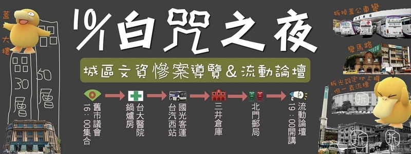 台北市政府文化局與法國在台協會協辦的「白晝之夜」,以北門為中心,延伸至大稻埕與228紀念公園等處,舉辦夜間活動與裝置藝術,當活動歡慶進行之際,台灣文化資產守護聯盟同時舉辦「白咒之夜」,聯盟表示北市府的白晝之夜只為美化西區門戶計畫,當初在法國舉辦的白晝之夜,關鍵精神是「公民參與」,在台灣卻完全被忽略,活動主要為諷刺柯市府未善盡保存責任、在即將消失的文化資產沿途舉辦文化活動。活動前半段為文資導覽活動加上文化行動,導覽的景點包含目前已經被拆除的舊市議會、即將改建為醫學美容的台大醫院院區,和自日治與戰後保存至今卻被拆一半的台大醫院舊館鍋爐房及煙囪,見證台灣客運史卻規畫拆除的台汽西站,以及三井倉庫與北門。文資團體將這些已「遇難」的古蹟建築以想像方式集合畫成了「柯P夢幻博物城」,諷刺在北市府眼中,這些富有歷史意義之建物,只能成為博物館裡的故事或遺跡,而參與民眾也於各文化景點貼上「符咒」,祈禱這些歷史建物能夠脫離文資慘案的命運。活動後半段則是公民論壇,讓文化古蹟的議題在一夜式的歡慶之餘,能持續被深化討論。
