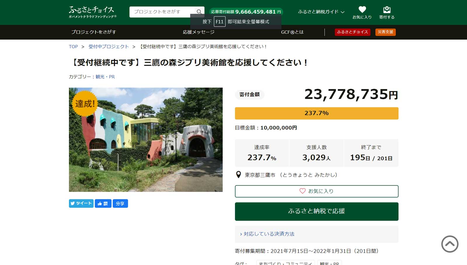 日本「故鄉捐」是2008年起日本政府因應地方人口流失造成稅基不足的問題,鼓勵外地遊子或是願意支持地方政府的民眾捐款給指定的地方政府,補充地方政府收入。捐款者可以減免部分所得稅,亦可以獲得該地方政府所贈與的當地特產。吉卜力美術館集資即是基於三鷹市「故鄉捐」特定需求方案成立。