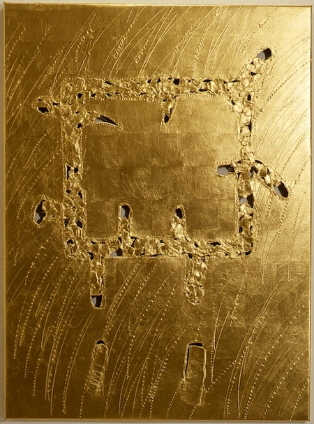 関根伸夫(Nobuo Sekine)《Phase Painting Ancient Festival》,金片、紙、畫布,130.3x97cm,1988。(YOD Gallery提供)