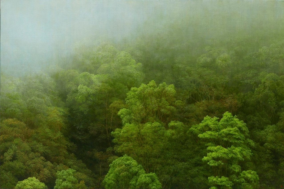葉子奇《四月的霧・玉里赤柯山》,卵彩、油畫、亞麻布,71.12×106.68cm,2017。(加力畫廊提供)