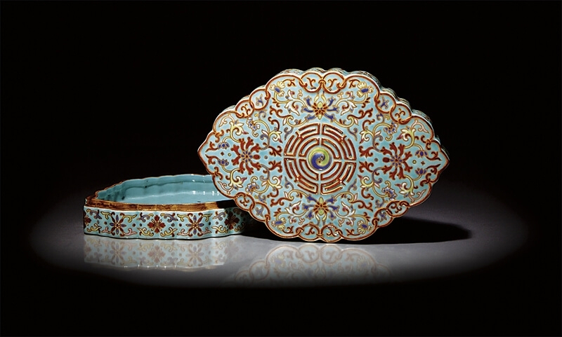 清乾隆〈松石綠地粉彩描金菱形蓋盒〉,加拿大蒙特利爾法裔外交家族舊藏。