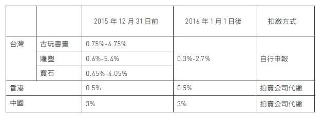 《所得稅法》修正案於去年10月完成,由21位立委跨黨派聯署,送交立法院議事處登錄,10月16號通過一讀,財政部於去年12月31日公告,將於2016年起大幅調降台灣藝術品拍賣稅率,自原本的0.75%-6.75%調整至0.3%-2.7%,為藝術產業界對此爭取十餘年,終可與香港的0.5%、中國3%稅率相互競爭的新突破。對此,亞洲藝術經濟研究中心執行長石隆盛指出,台灣舊制的拍賣稅率使許多藏家寧可將藝術品送到香港,也不願意將藏品委交台灣拍賣公司拍賣,這樣的結果導致近十年台灣藝術市場出現高單價藝術品委交香港拍賣,而台灣藏家又到香港進行作品收藏交易的怪象。