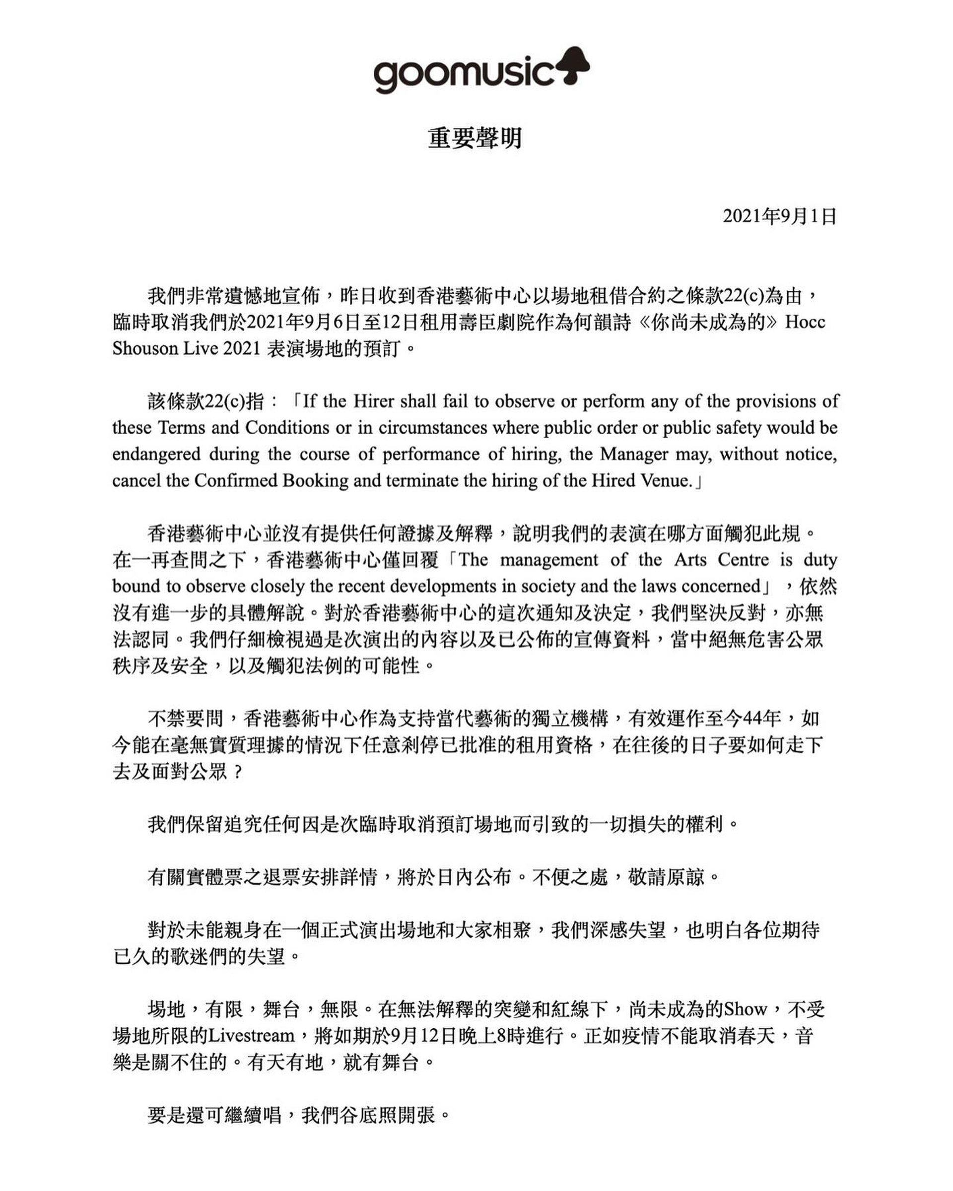 香港歌手何韻詩「你尚未成為的」演唱會臨時「被消失」,對此何韻詩於社群媒體發布聲明。(擷取自何韻詩粉絲專頁