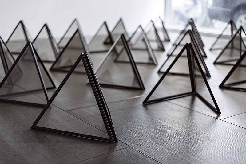 擺在新苑藝術大片落地窗前的《宇宙》,足以說明這次展覽的中樞觀念—25個正三角形玻璃角錐,僅兩面嵌著茶色玻璃,另兩面則都是缺口,共4種規格;除了每個單體可以不同形式的點、線、面討論其內在空間性,也可引入外在環境中光的變化,包含人事物的移動、天氣晴雨差異等,讓空間產生另一空間,藉由隱隱堆疊出的多層空間切片,豐富觀者所見與所在之餘,也回歸藝術家創作脈絡中低限美學所給出的手勢。同時,25個四面體經藝術家演算後,缺口方向不一,其黑白線位置也不同,企圖回應其英文名稱「cosmos」所意味的秩序,也就是說每一單體的翻轉都象徵著諸事萬物運作的規律及其平衡。