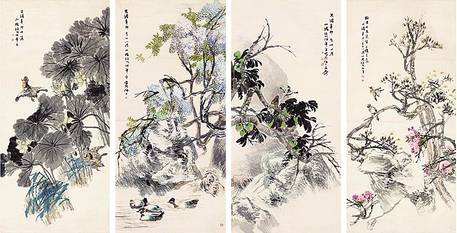 任頤1891年作〈花鳥四屏〉,246.5×117公分。