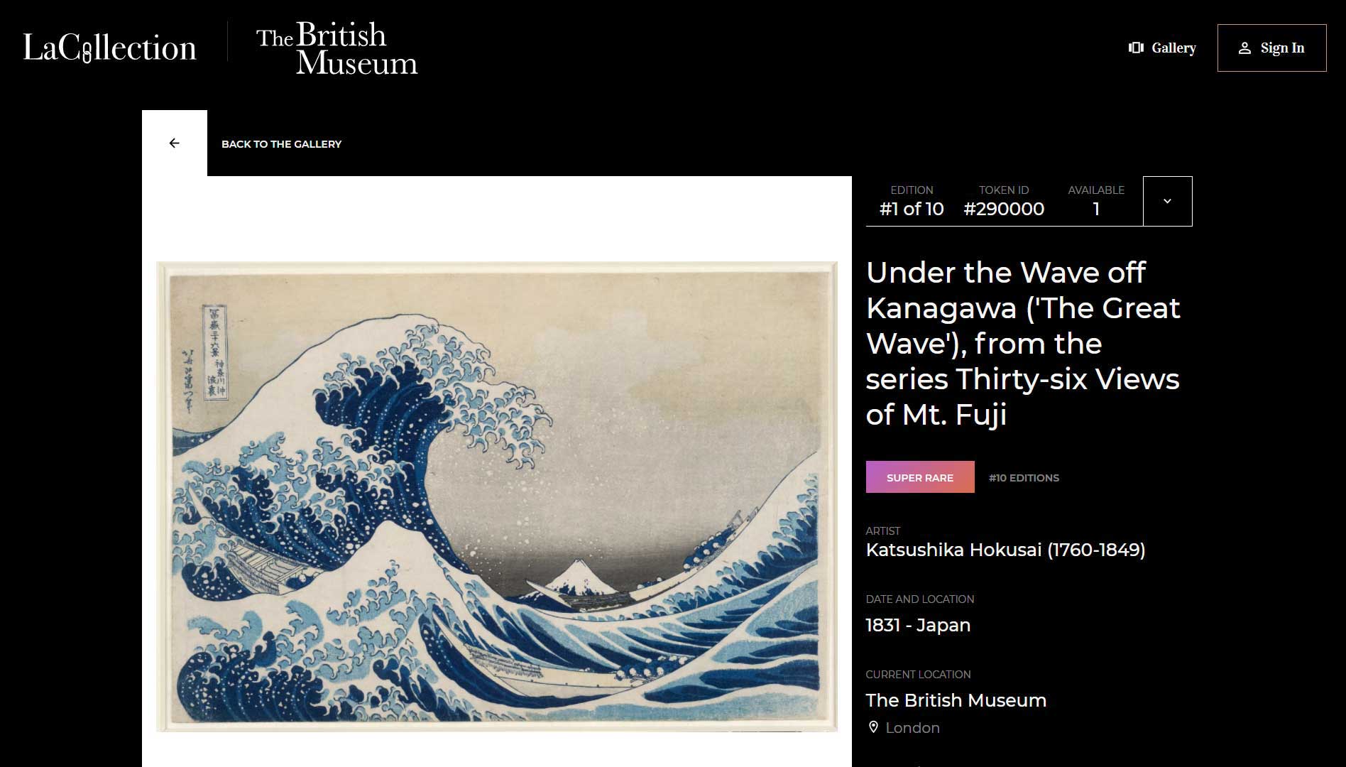 在拍賣市場投入NFT藝術作品風潮後,博物館界也開始跟進。日前大英博物館宣布將與法國新創公司LaCollection合作,將館藏作品以NFT方式進行販售,當中包含著名的日本浮世繪大師葛飾北齋(Hokusai Katsushika)《富嶽三十六景》中的《神奈川沖浪裏》。