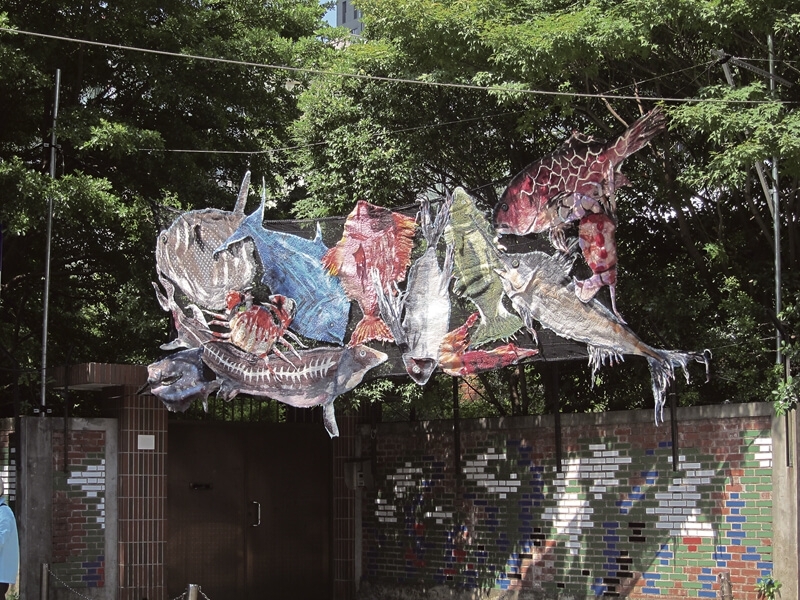 康雅筑以羊毛氈製成的甲殼類生物與台灣瀕臨絕種的特種大型魚類造型,懸掛在艷陽高照的台北仁愛里街頭,帶有童趣之感的《晒魚乾》作品飽含著關懷環境的寓意。(富邦藝術基金會提供)
