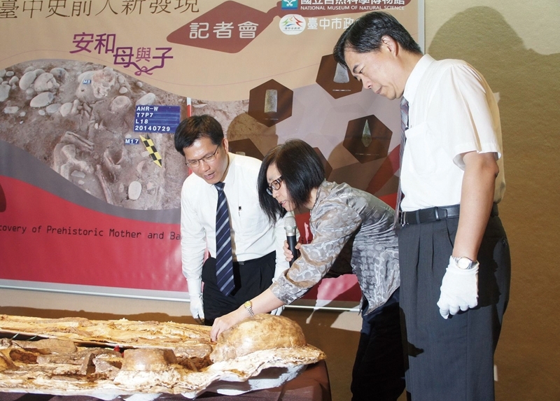 左起台中市市長林佳龍、科博館主任屈慧麗及館長孫維新觀看安和遺址出土人骨。圖/國立自然科學博物館